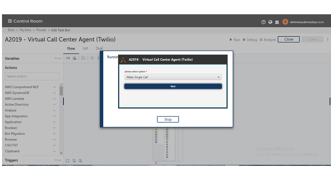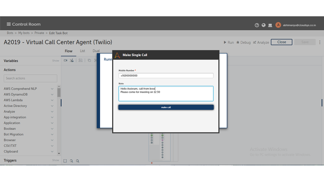 This Bot will help to generate automated calls for one or more people without raising a phone call. It helps to call people/employees instantly. The user can generate single or multiple calls. The user's text will be converted into voice to the receiver and only one call will initiate at a time.