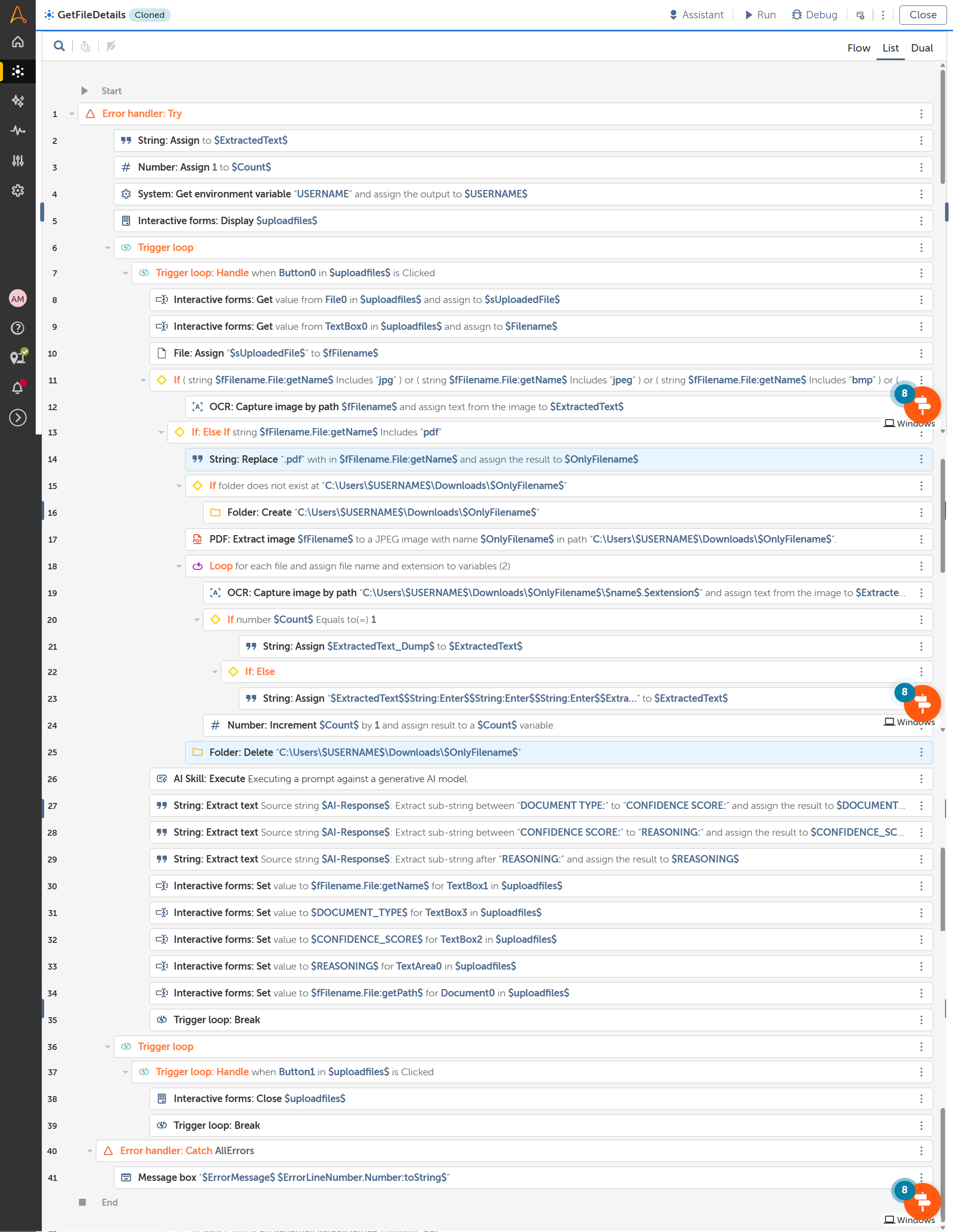 This A360 bot solves that problem by intelligently classifying uploaded documents using AI. The process begins when a user uploads a single document via a form interface. The bot reads the document line-by-line, analyzes its content, and returns three key outputs: the document type (e.g., Invoice, PO), a confidence score (e.g., 92%), and a natural-language explanation describing why the document was classified that way. These outputs make automation decisions transparent and auditable.