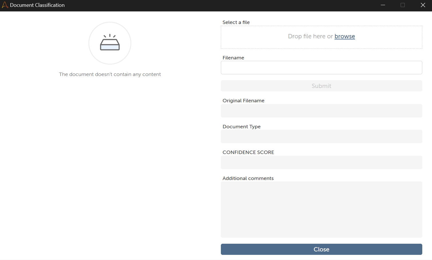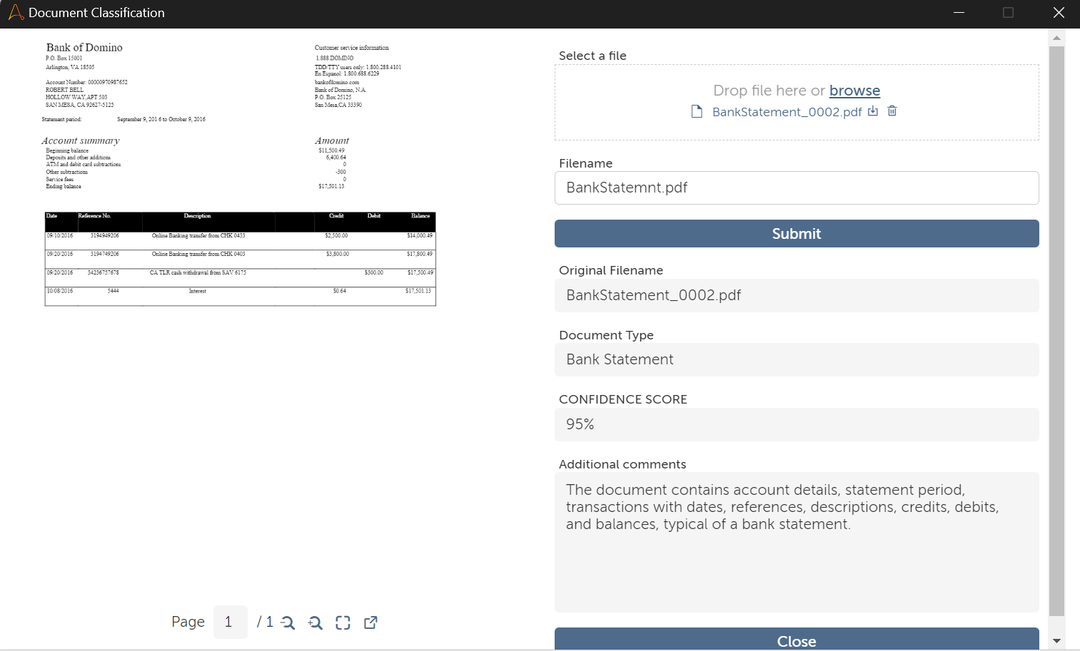 Inputs: Single document upload via form (PDF format). Actions: AI-based classification using line-by-line content analysis. Outputs: Document type, confidence score, and explanation. Keywords: Document Classification, Confidence Score, Explanation