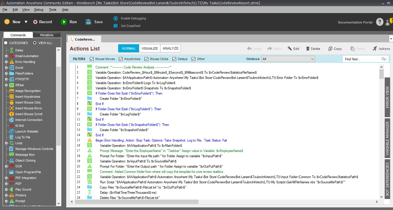 This Bot is an extended version of AA Code review bot which analyses AA code and compares it with a set of pre-defined standard coding procedures and gives an output with the criticality of each line of code. It ensures that the code tunes fine with all controls that are required for the Bot deployment & execution.