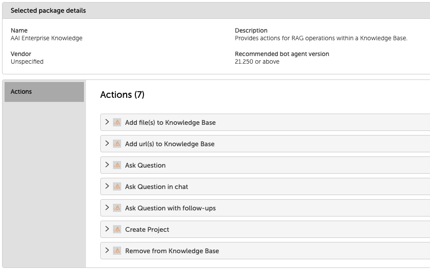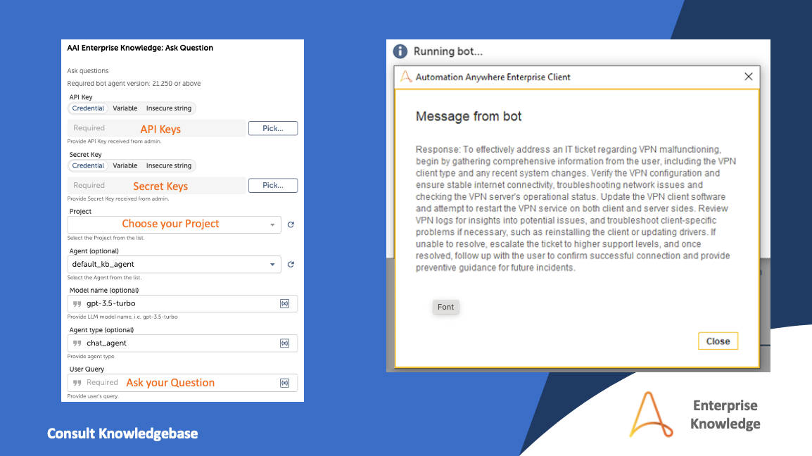 This cutting-edge package is designed to harness the power of Automation Anywhere’s Enterprise Knowledge, powered by ODIN AI and the revolutionary Retrieve and Generate (RAG) model. This innovative connector empowers developers to create intelligent agents infused with state-of-the-art AI capabilities. Leveraging the latest advancements in GenAI technology, developers can seamlessly integrate RAG models into their applications, enabling them to retrieve and generate information with unparalleled accuracy and efficiency. Whether you're building chatbots, virtual assistants, or knowledge retrieval systems, the Knowledge Retrieval & Conversational package provides the tools you need to unlock the full potential of AI-powered automations. Experience the future of AI-driven interactions with the Automation Success Platform.