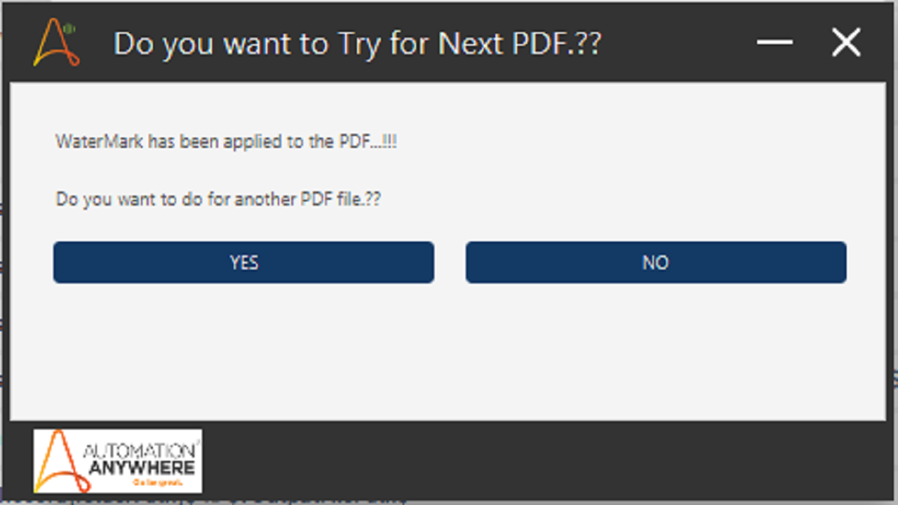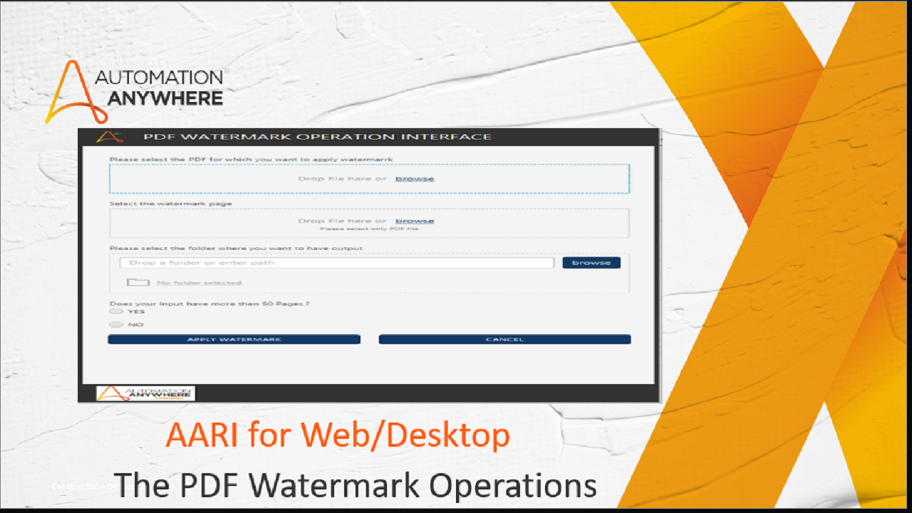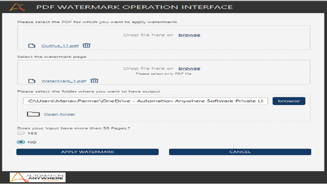This Automation will fill/apply the Watermark into the input PDF which has been selected by end-user from the AARI interactive form