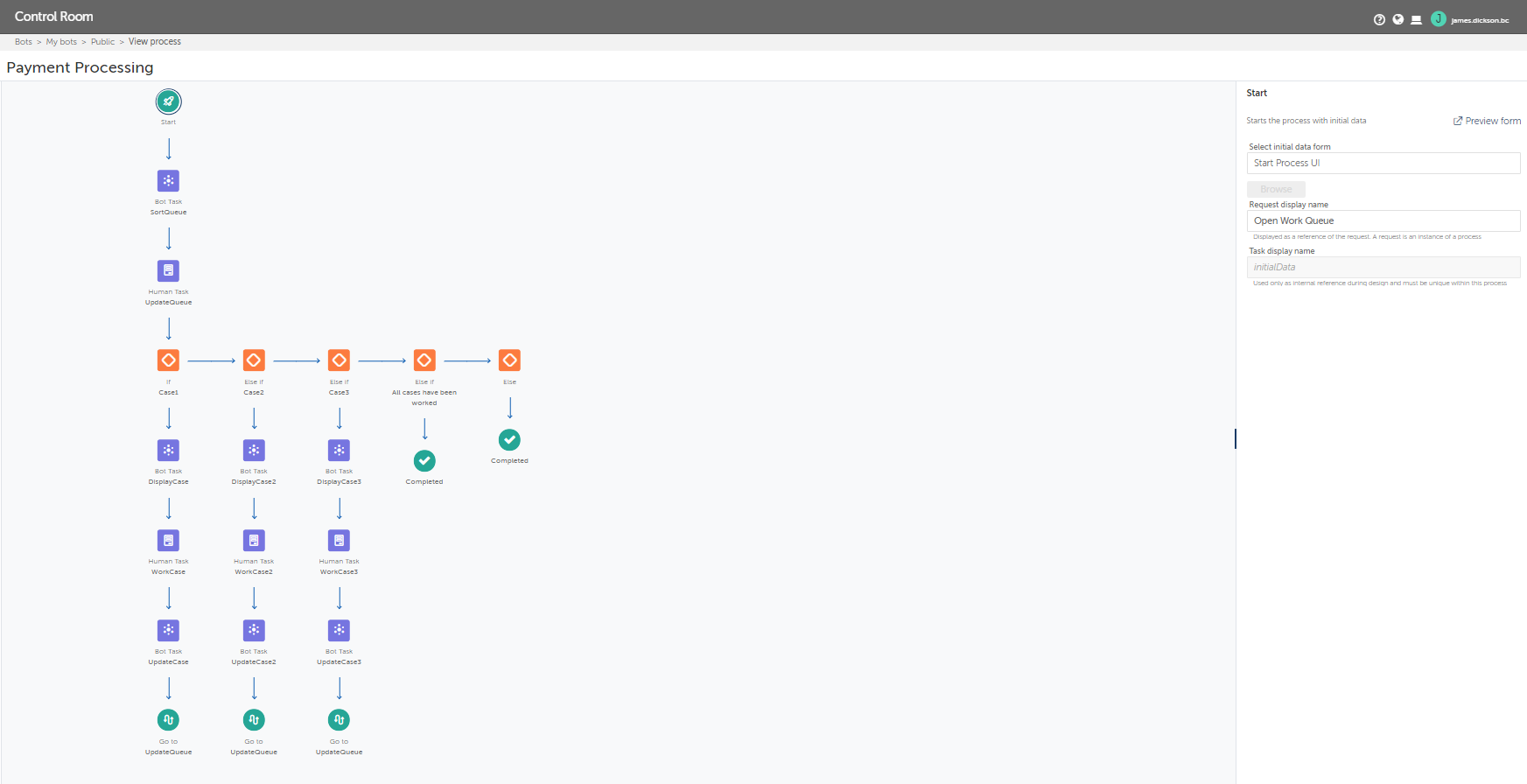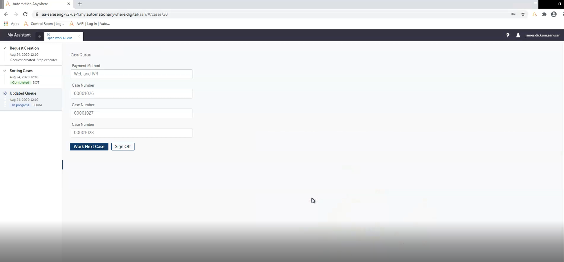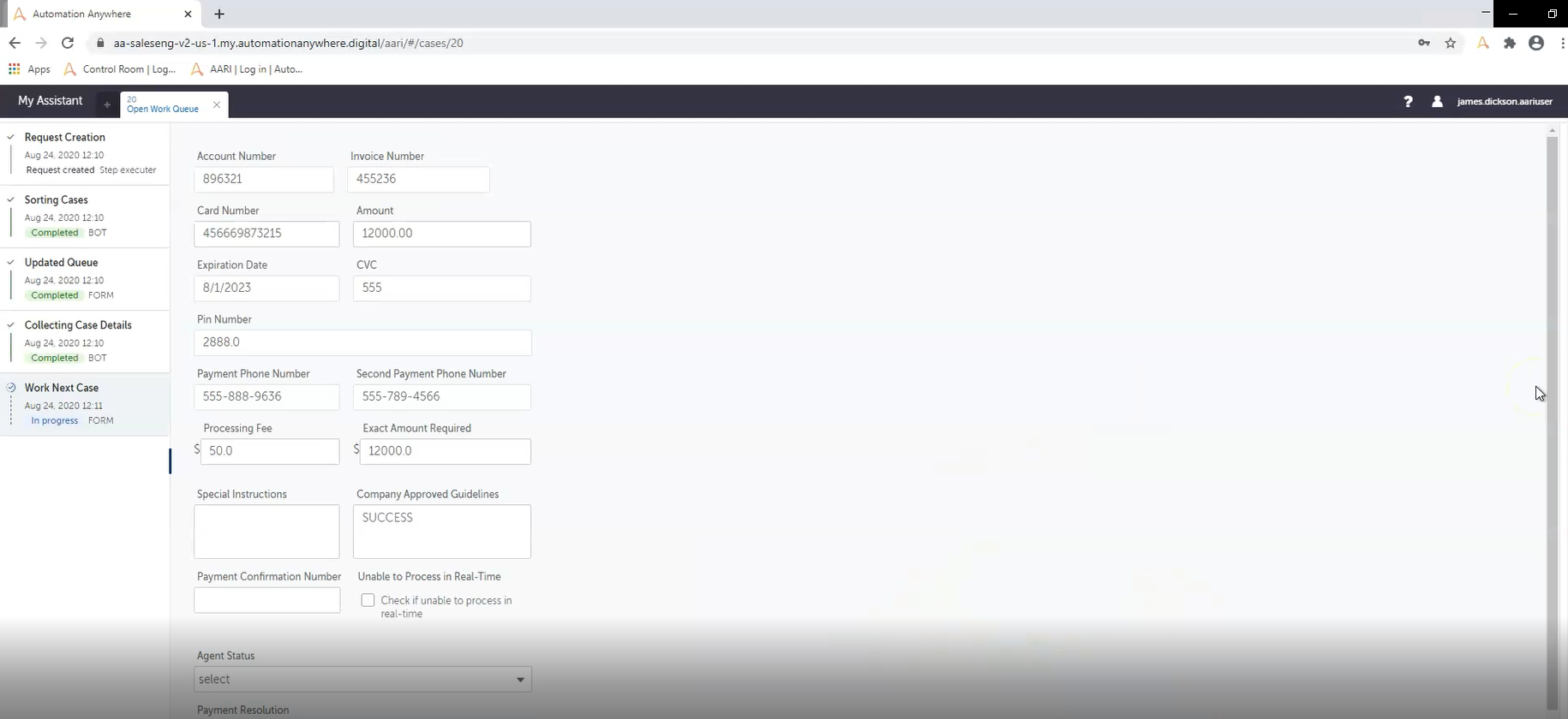 A user logs into AARI and kicks off a workflow, where a digital assistant accesses SFDC and mainframe apps while the Agent simply clicks through a simple interface in a web browser. Payment information for each case is intuitively displayed, where the Agent can enter notes and status updates inline, while the bot does all the heavy-lifting on the backend across various systems of record.