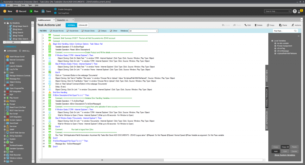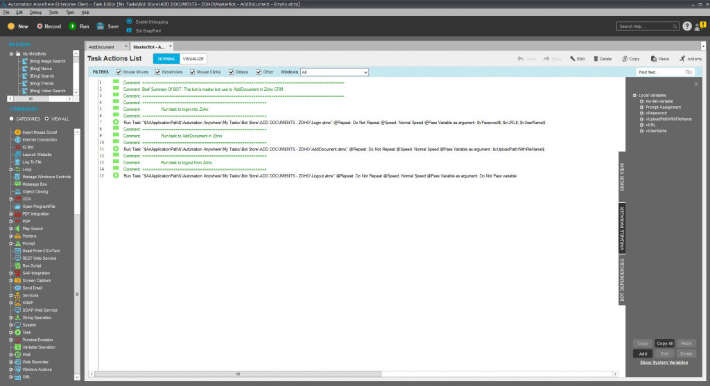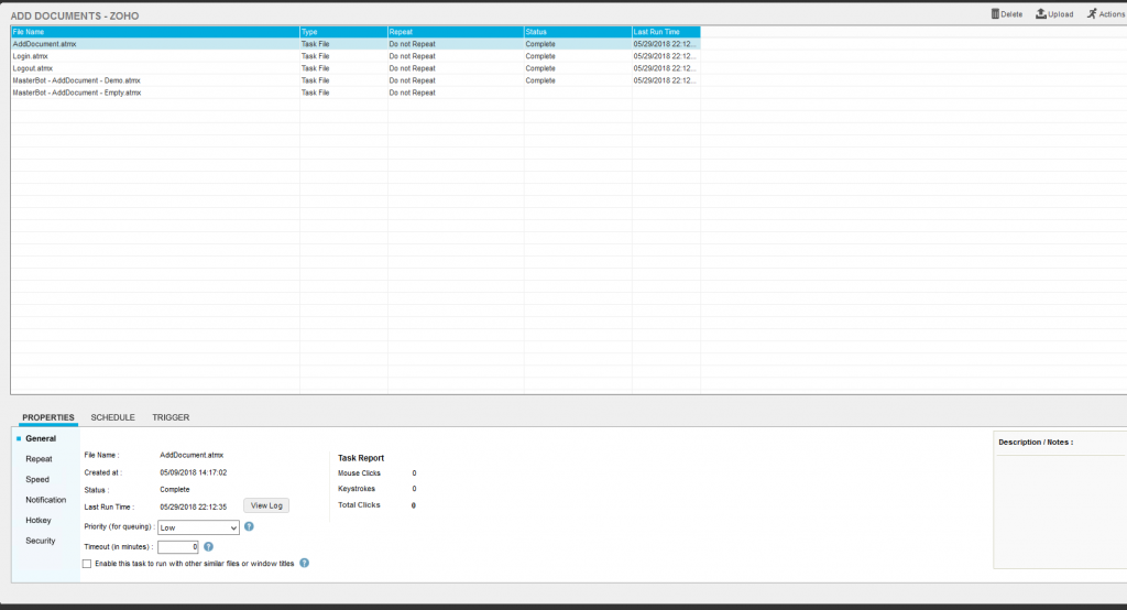 This bot is designed to login into ZOHO, go into the add document tab, and upload a new document in Zoho from the provided file on a given location.