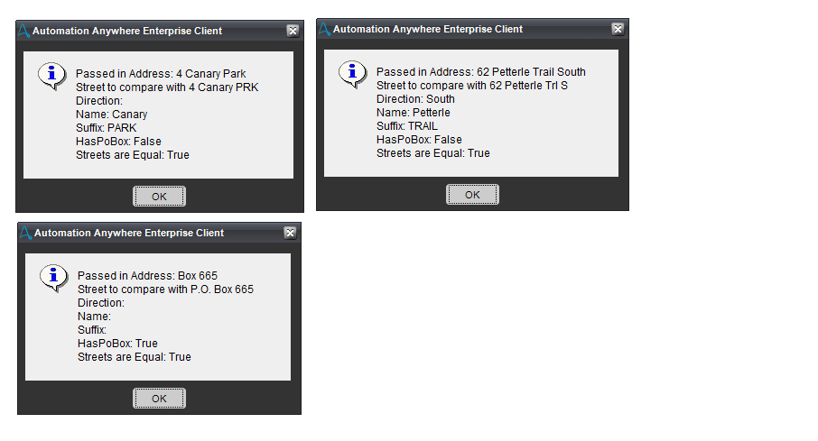 The Address Utility Bot can also detect the direction of the street or if it has a PO Box, even if the PO box name is in several formats. It can extract the street number, the street name, the street suffix, and the street direction. It can determine if two street addresses are the same even though they may be spelled slightly differently. For example, it will determine that 1329 WALKERS CHAPEL Avenue North is the same address as 1329 Walkers Chapel Ave. N.