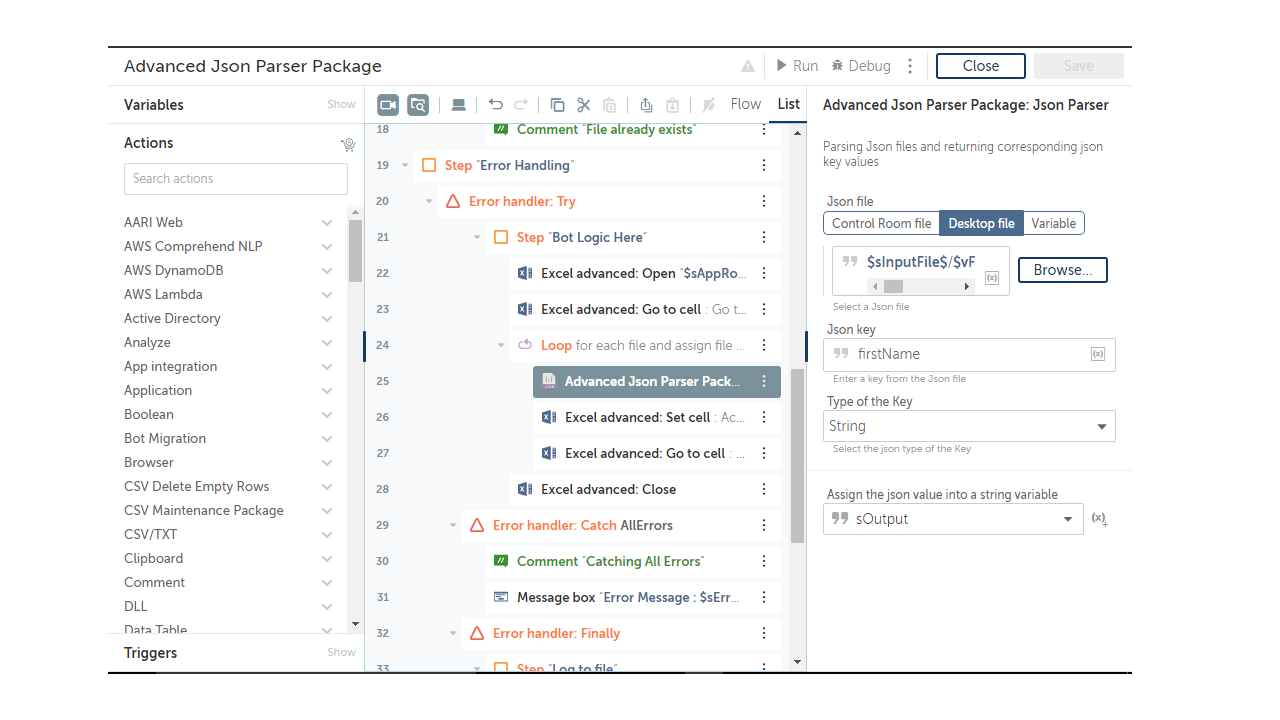 This package includes an action called 'JSON Parser,' which is used to get JSON values of the user-specified key. Any type of data can be processed by this package. The JSON Parser action is used for returning the JSON value of a key from the given file.