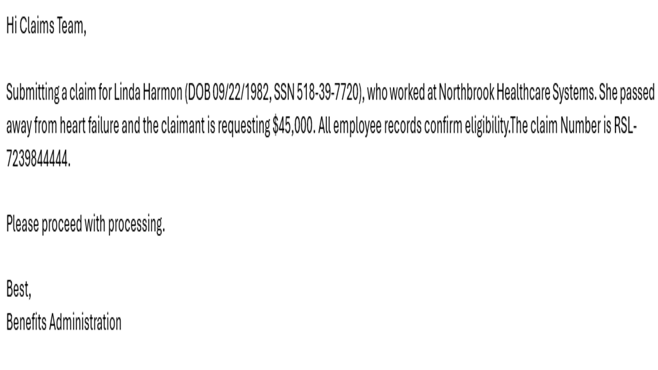 Claim details are received via email in either structured or unstructured formats. An agent validates the claim for completeness. If mandatory information is missing, an automated email is sent requesting the required details.