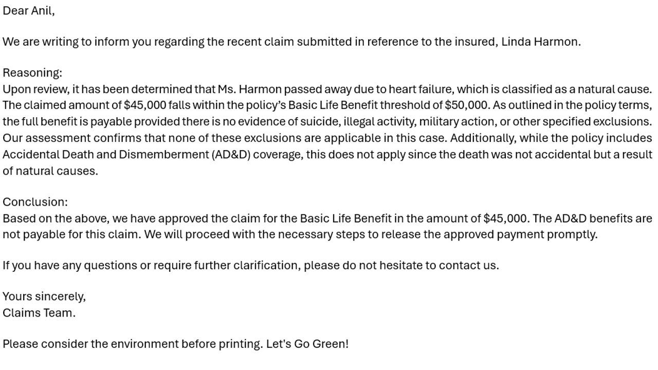 Complete claim details are validated against policy terms and coverage limits. Based on validation results, the agent decides whether to approve the claim automatically or route it for human review.