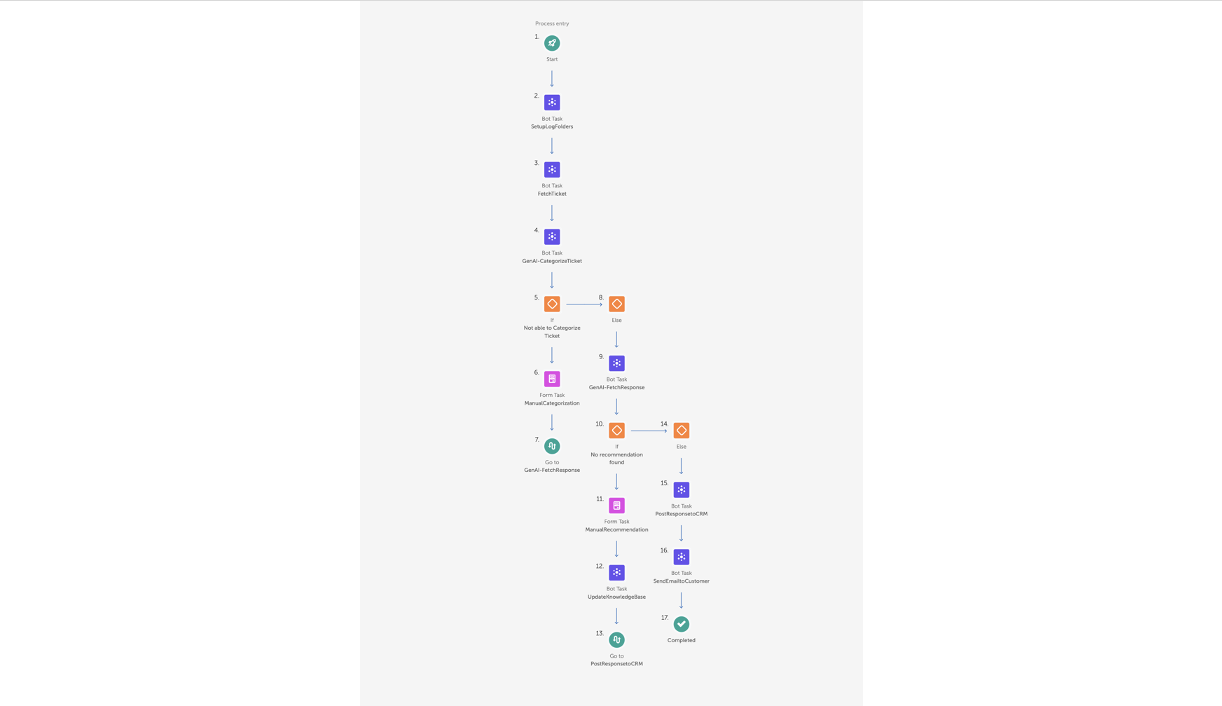 This Intelligent Automation is a next-gen prebuilt process template to easily deploy an Intelligent Automation capable of solving common customer service requests like technical support, complaints, product support and many more. Embedded with GenAI Skills, this Service Operations Intelligent Automation will allow your company to handle transactions faster and provide better answers to your customers.