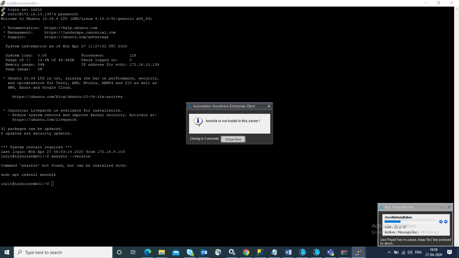 Bot will check if Ansible is installed or not on the server. If it is present, it will show a popup for 'already installed' and ask to uninstall (if required then click on Yes else No ).