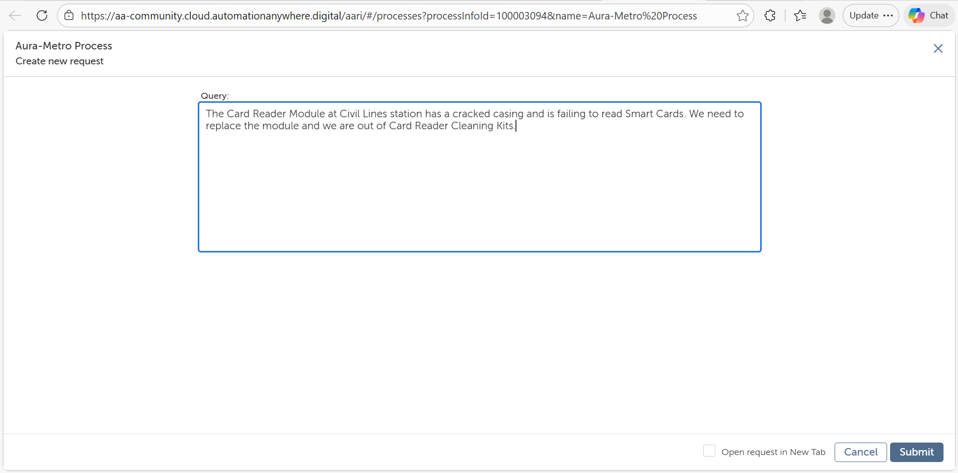 Aura Metro is an advanced AI-driven solution designed for transit operations. It leverages Automation 360 (A360), Generative AI, and Salesforce to transform how metro staff report incidents and manage maintenance. By integrating an Enterprise Knowledge Base with CRM workflows, Aura Metro moves beyond simple data entry, acting as an intelligent partner that parses technical manuals and executes end-to-end operational tasks.