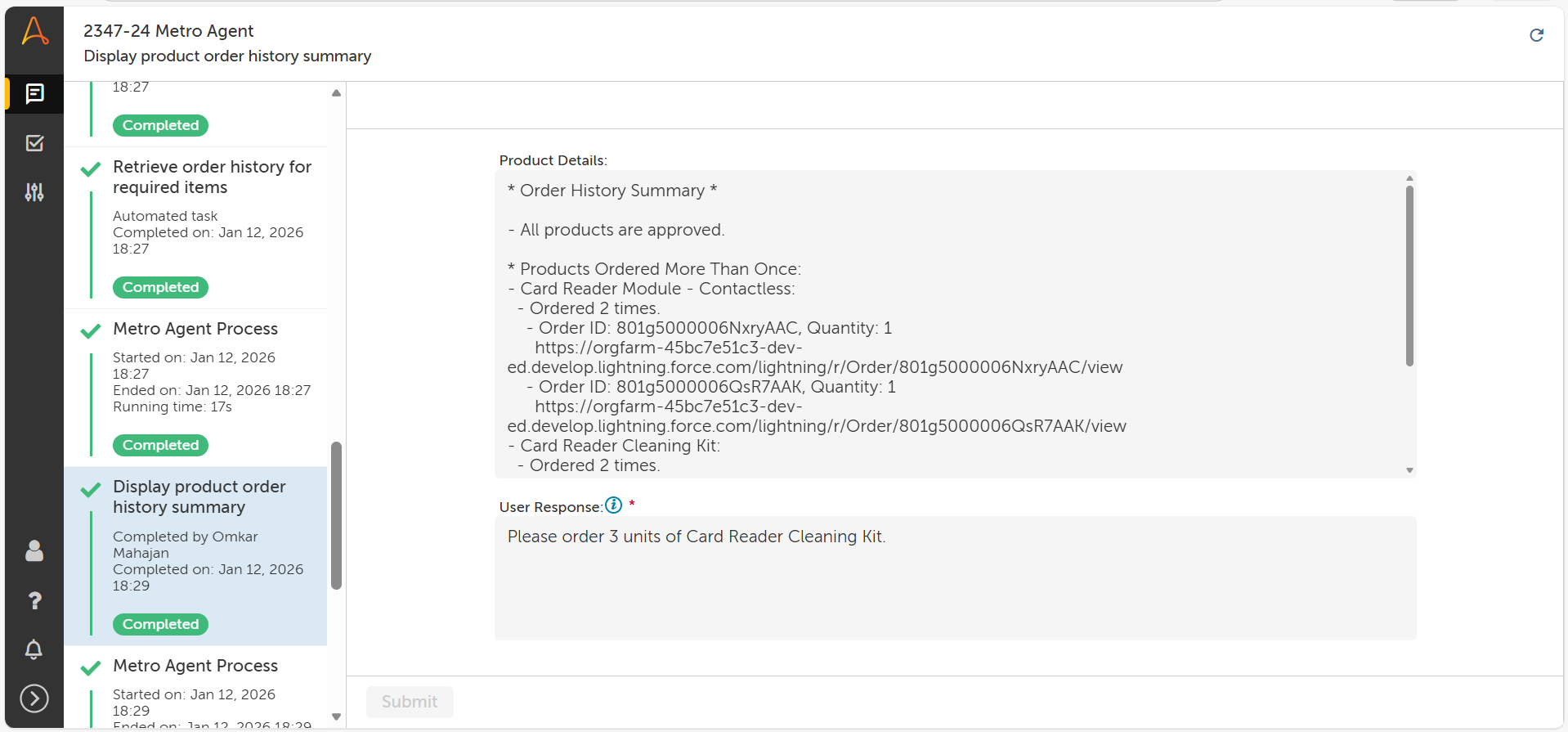 Contextual Intelligence: The agent reviews order history to prevent duplicate purchases and understands natural language intent to customize procurement.