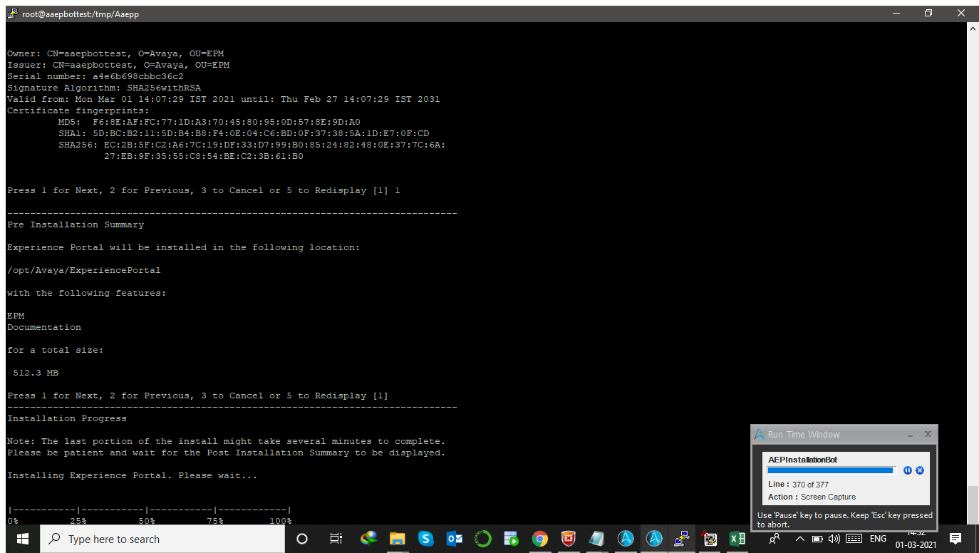 This bot will be useful to automate the installation of the Avaya experience portal on the Linux platform. Only we need to have the Linux OS setup ready, and the bot can perform all the installation steps without any human intervention. Hence with the help of this bot, the entire process will be automated without any human involvement