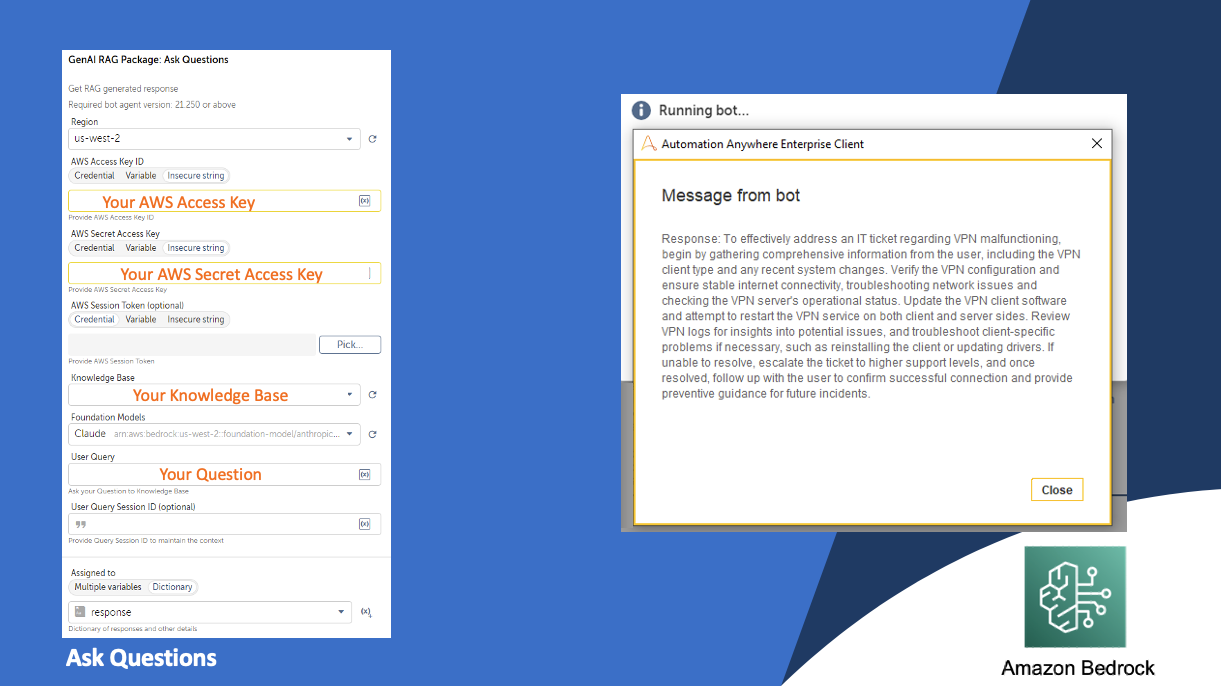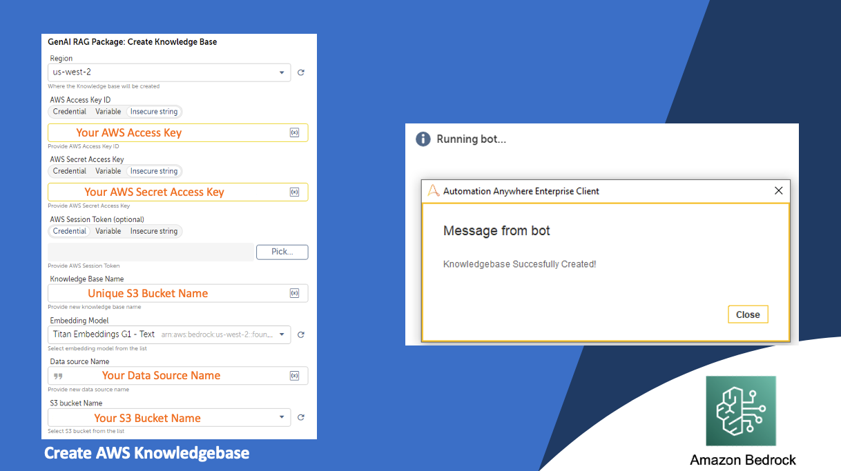 This package is a next-gen connector harnessing AWS Bedrock and AWS Knowledgebases, utilizing RAG to create highly knowledgeable automations for seamless interactions, faster knowledge retrieval and collaboration