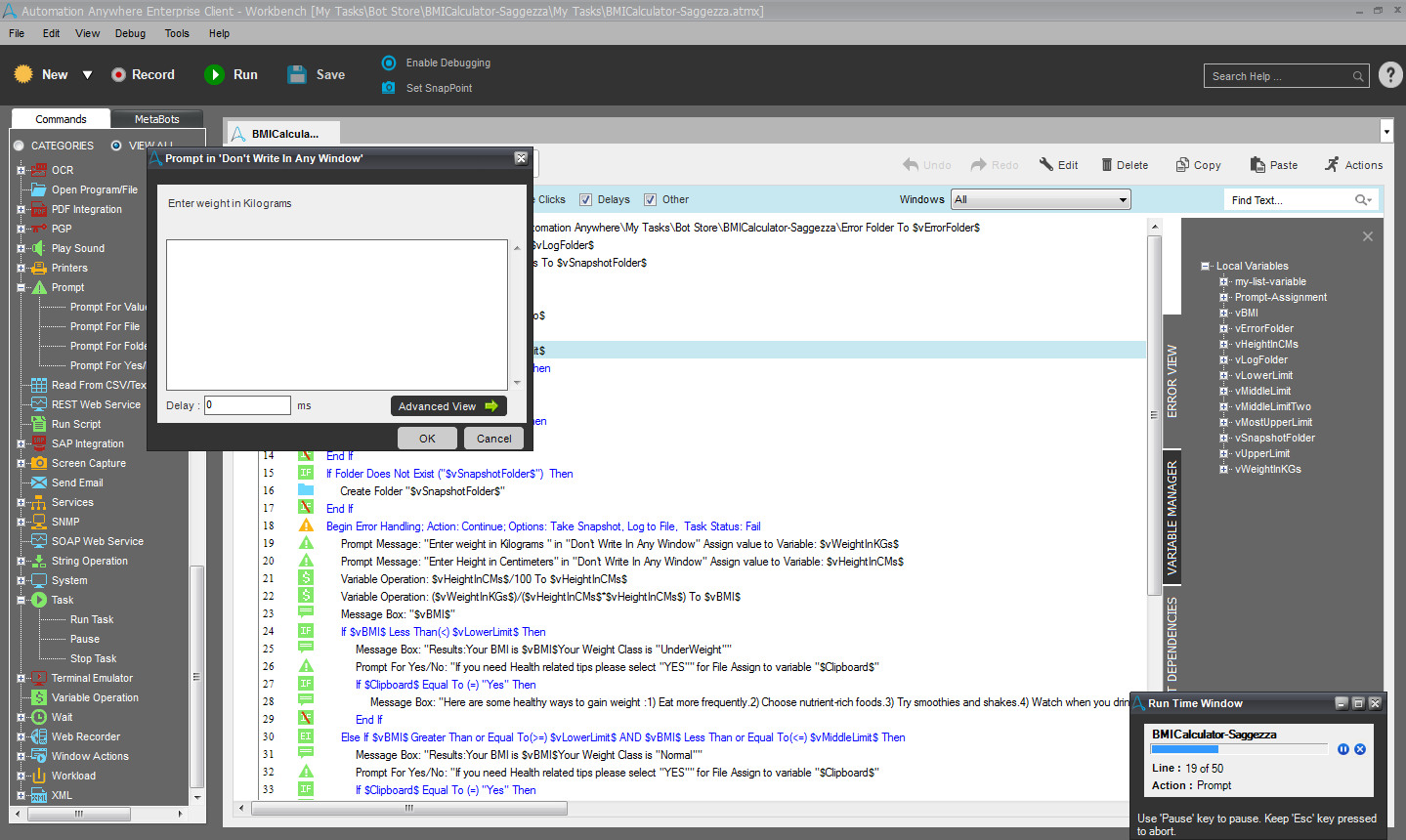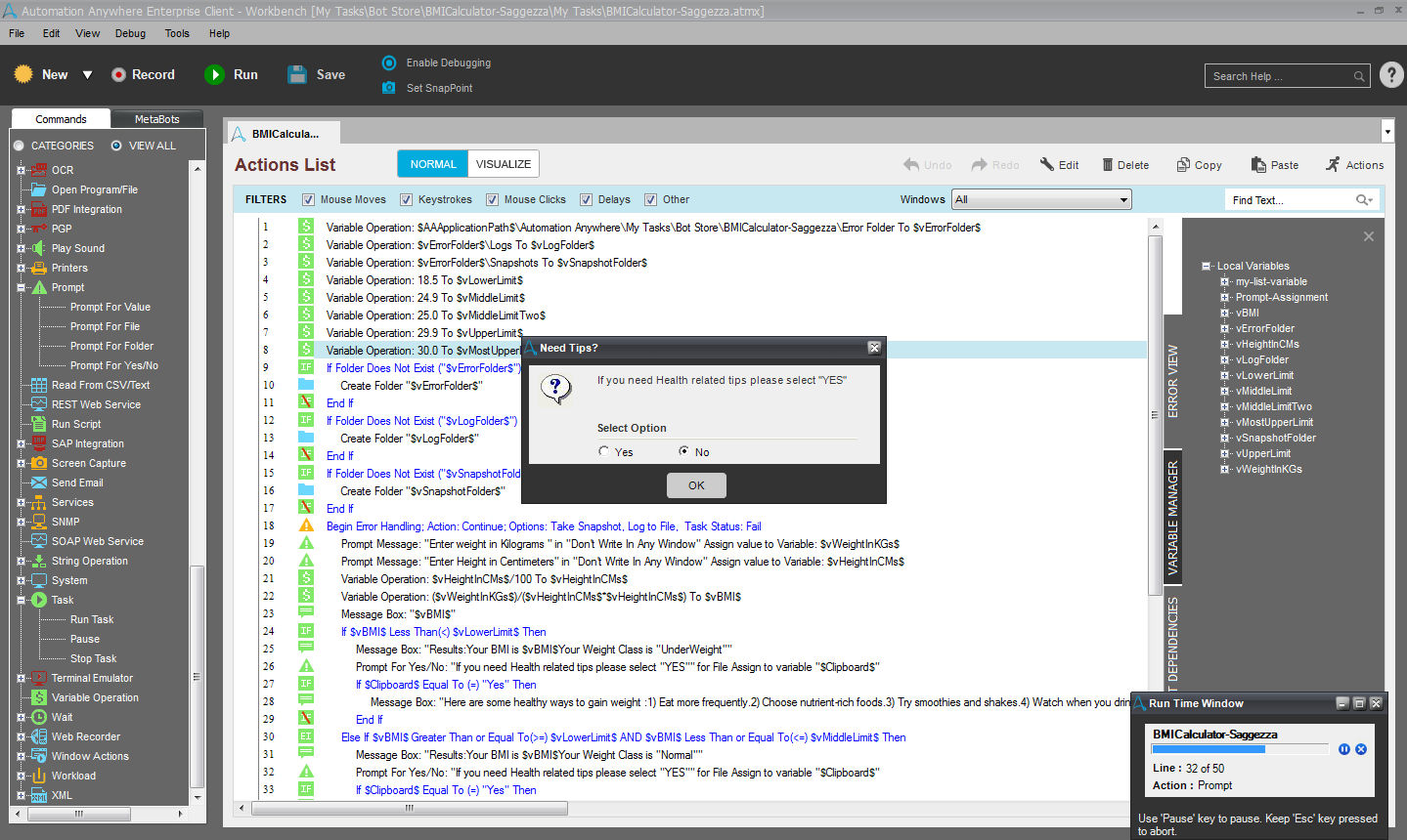 Use cases: This is a reusable component to include in a process flow. This bot helps the user calculate BMI in a fraction of a second.