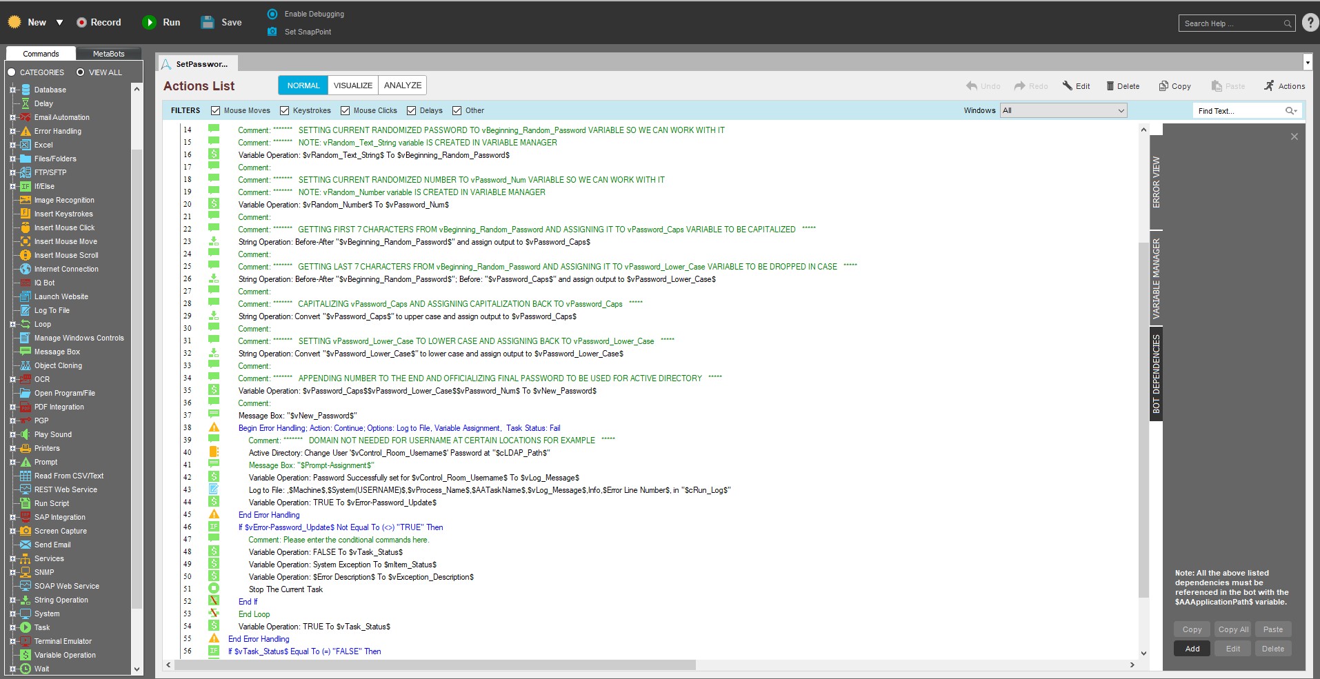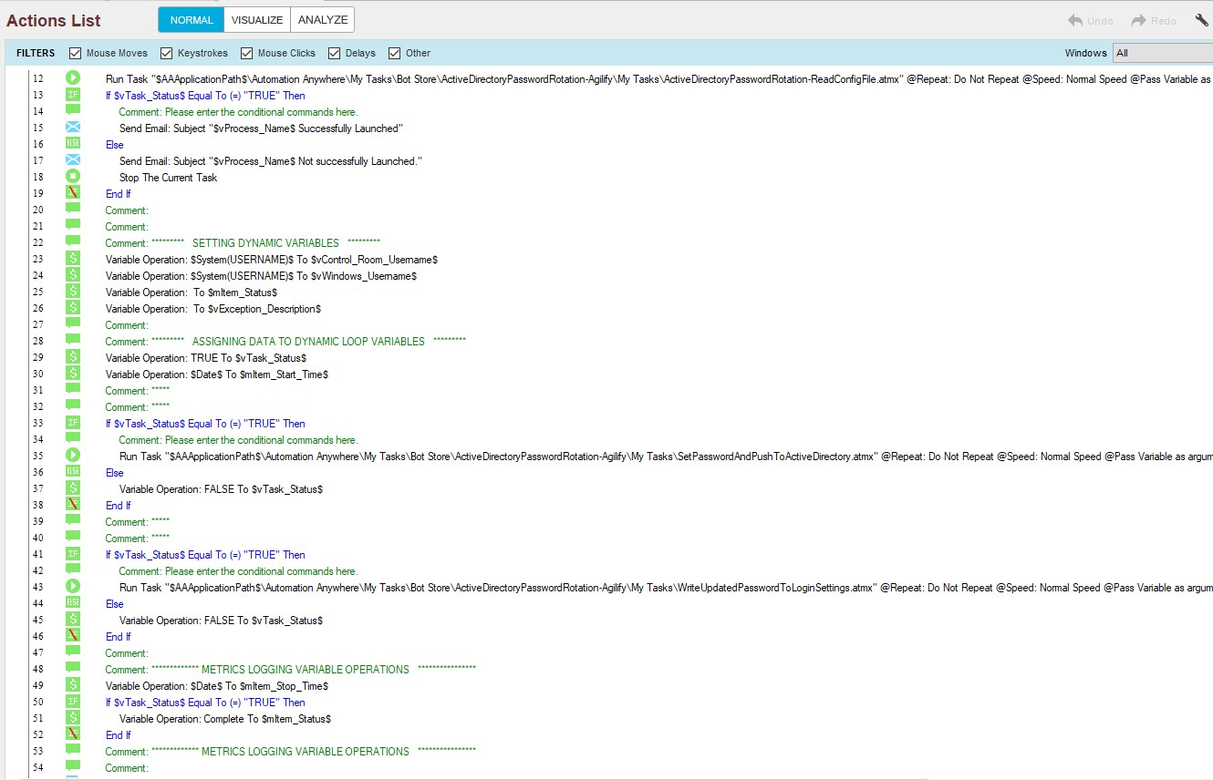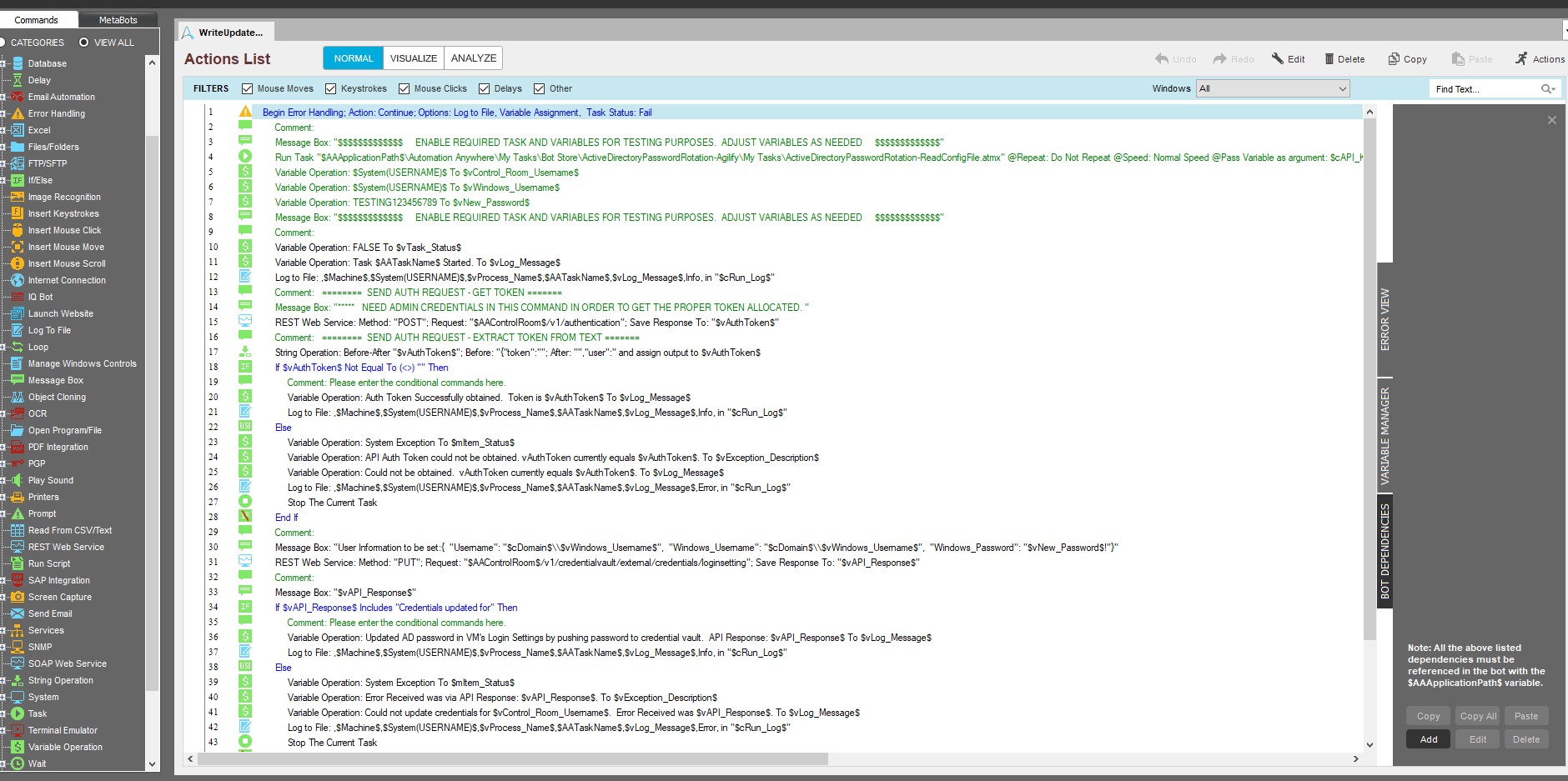 This bot accomplishes the task of resetting a Bot Runner’s Active Directory password and pushing that updated password into said Bot Runner's Client Login settings. This enable a cyclical password reset process per your organization's requirements, minimizing human interaction and human error. Having the passwords reset in an automated fashion will have a tremendous effect on any audits due to the consistency and accuracy of the automated process every time.