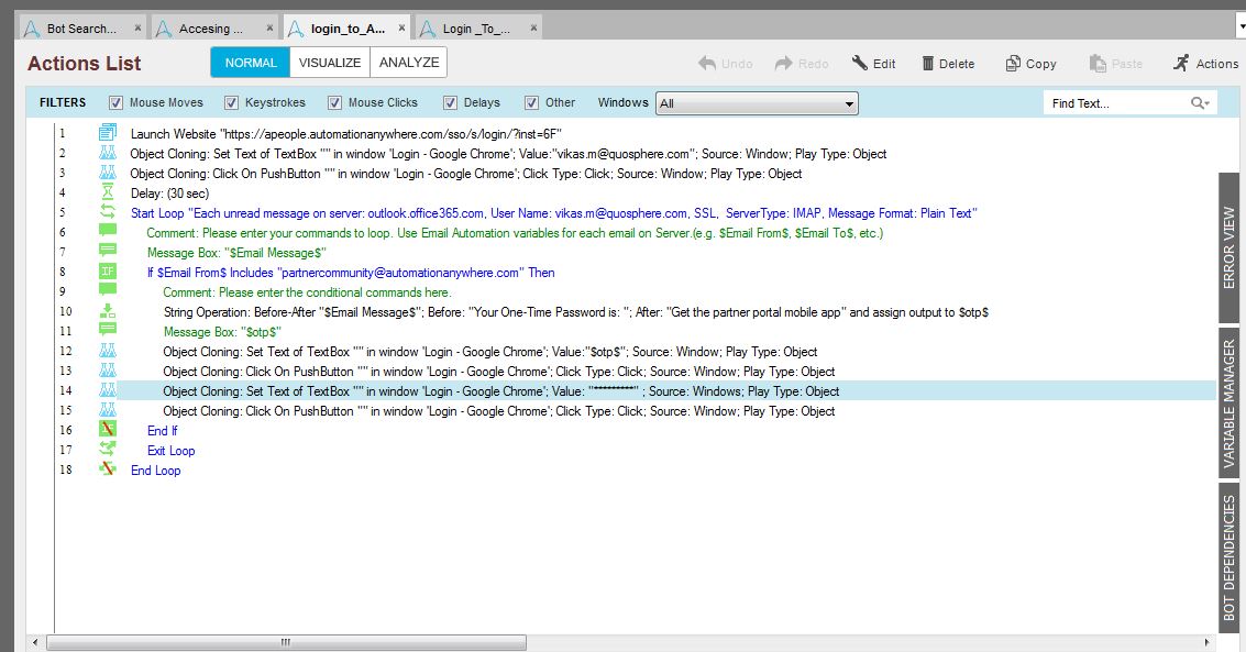 This bot performs the following: Login to Automation Anywhere Bot Store. It will take the OTP from Outlook mail and store it into an OTP variable and login to Bot Store and then search for the bot you want.