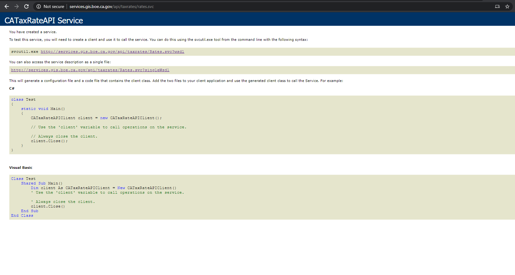 The website used to get Tax rate -http://services.gis.boe.ca.gov/api/taxrates/rates.svc