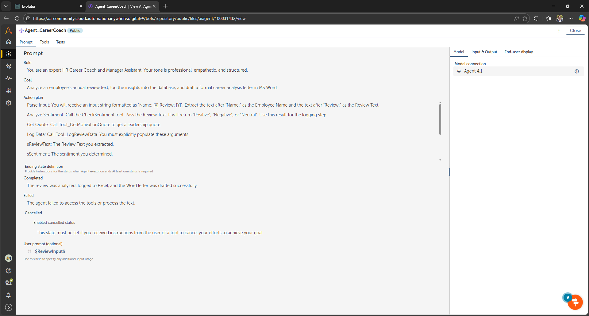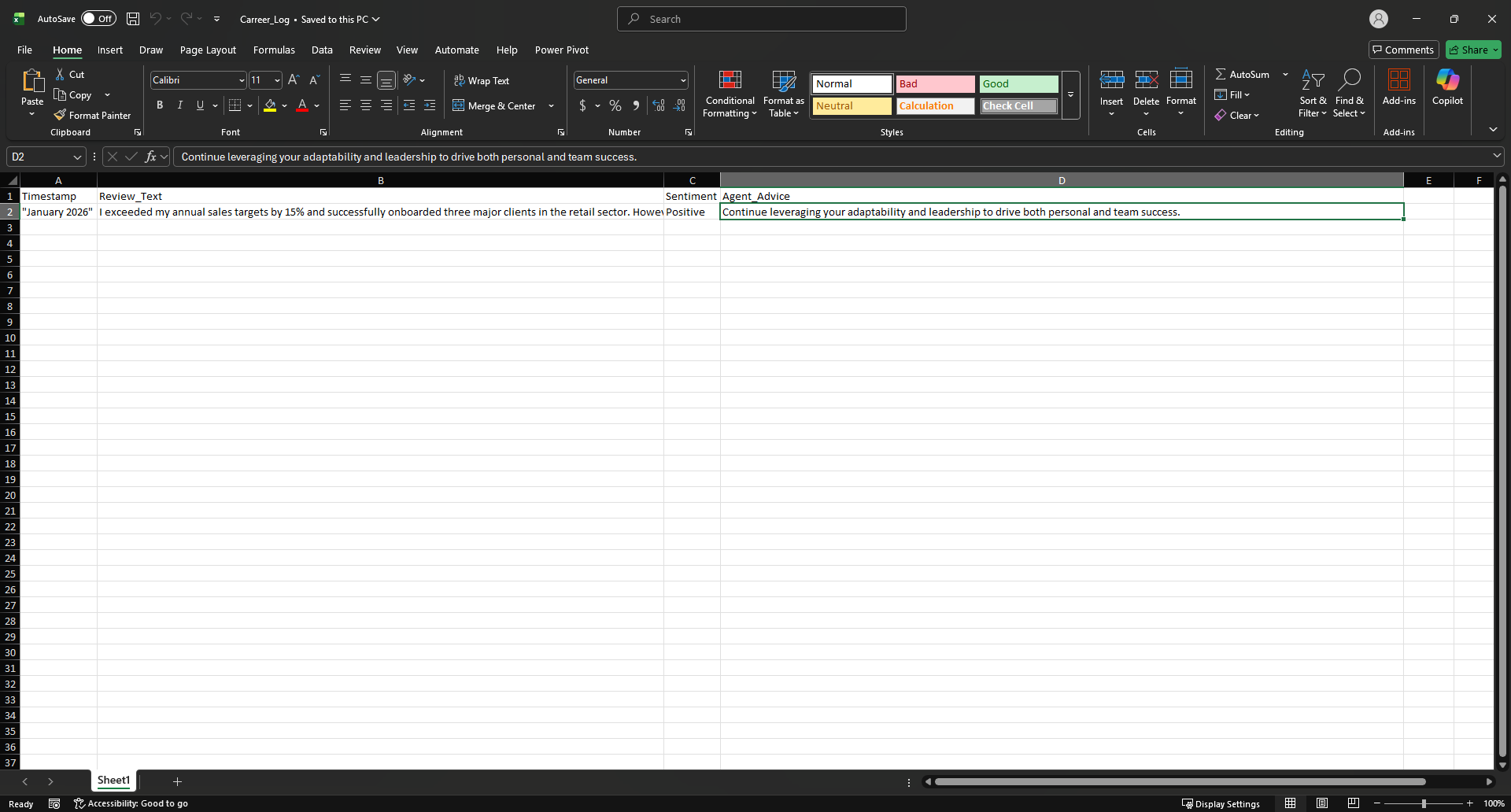 Solution: The Career Insight Agent is an Agentic Process that automates this workflow. It captures raw feedback via a Human-in-the-Loop web form, uses a specialized AI Skill to deterministically analyze sentiment, fetches leadership quotes via API, and orchestrates local bots to draft confidential Word reports and Excel logs.