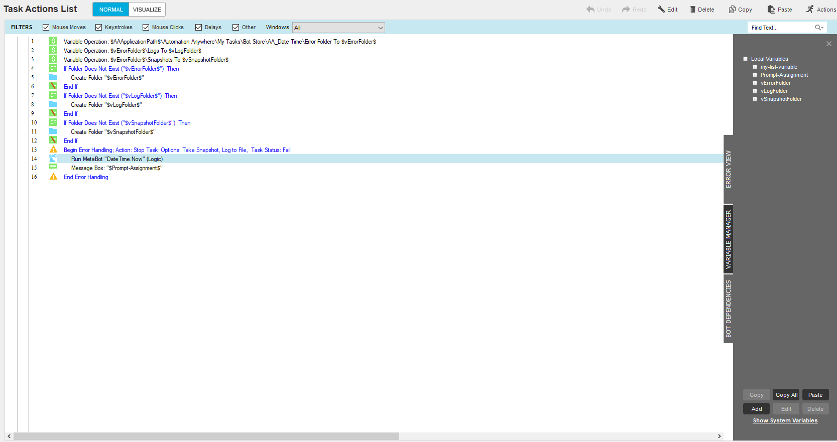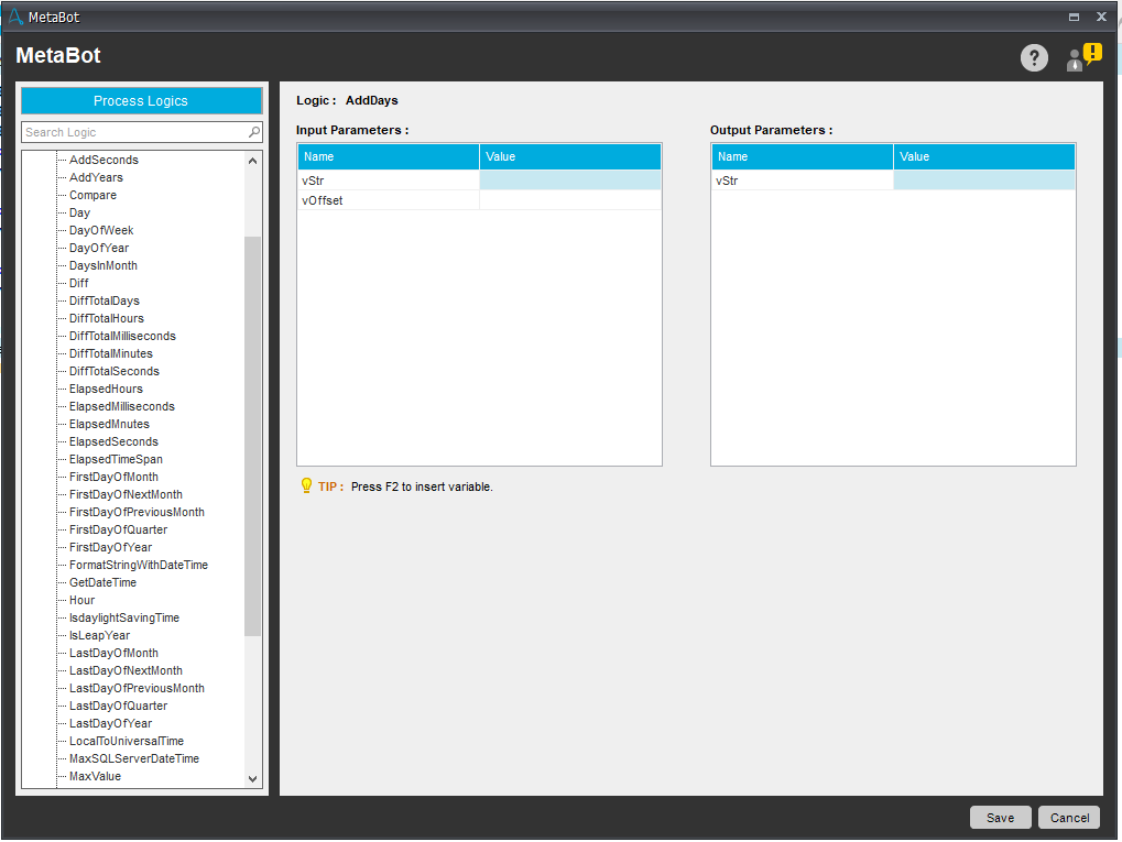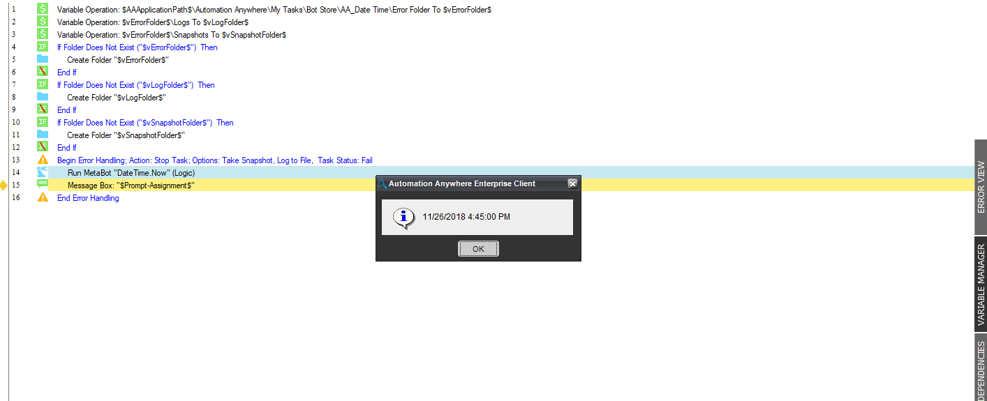 The Change Date and Time Format bot is a useful utility for performing operations like adding seconds/minutes/hours/days/months/years to an existing date/time, changing date formats from one to another, finding the difference between two date/times, comparing dates, and identifying day name among other available date/time operations.