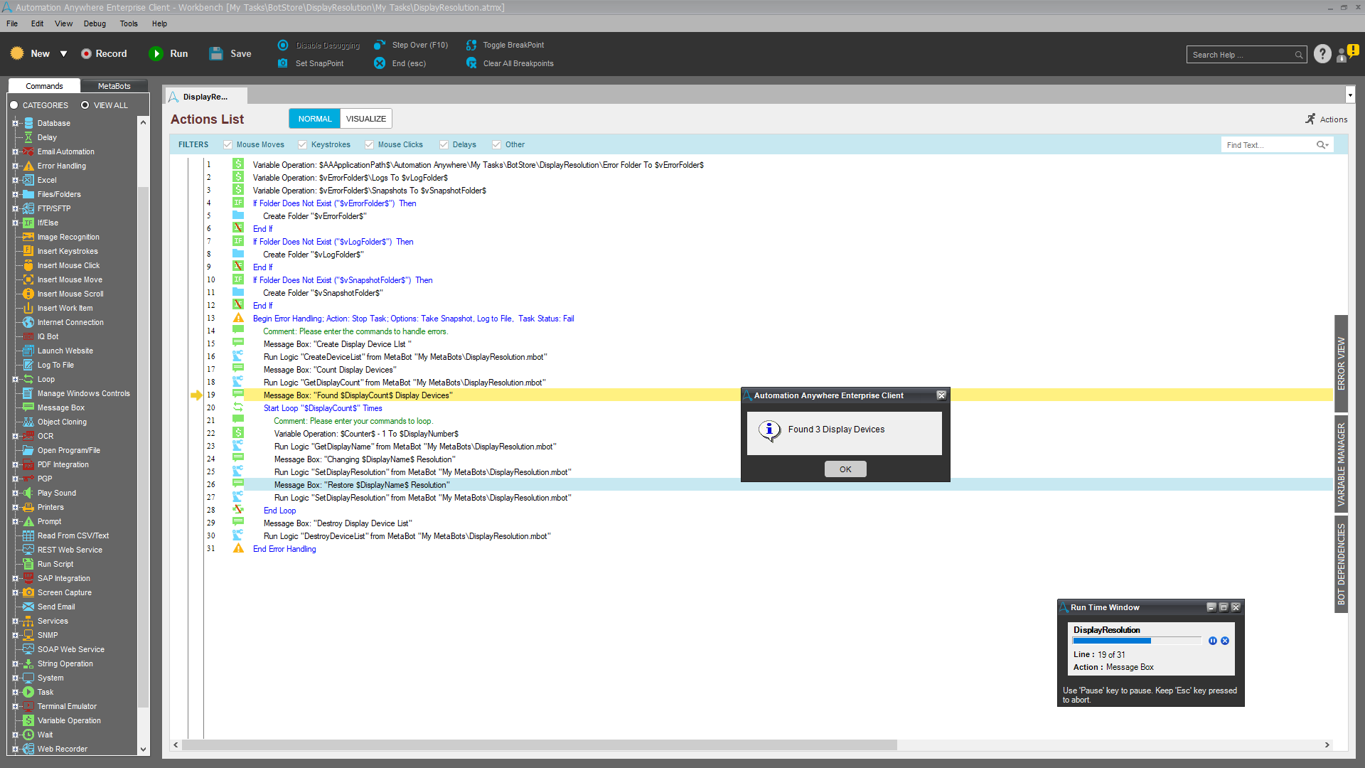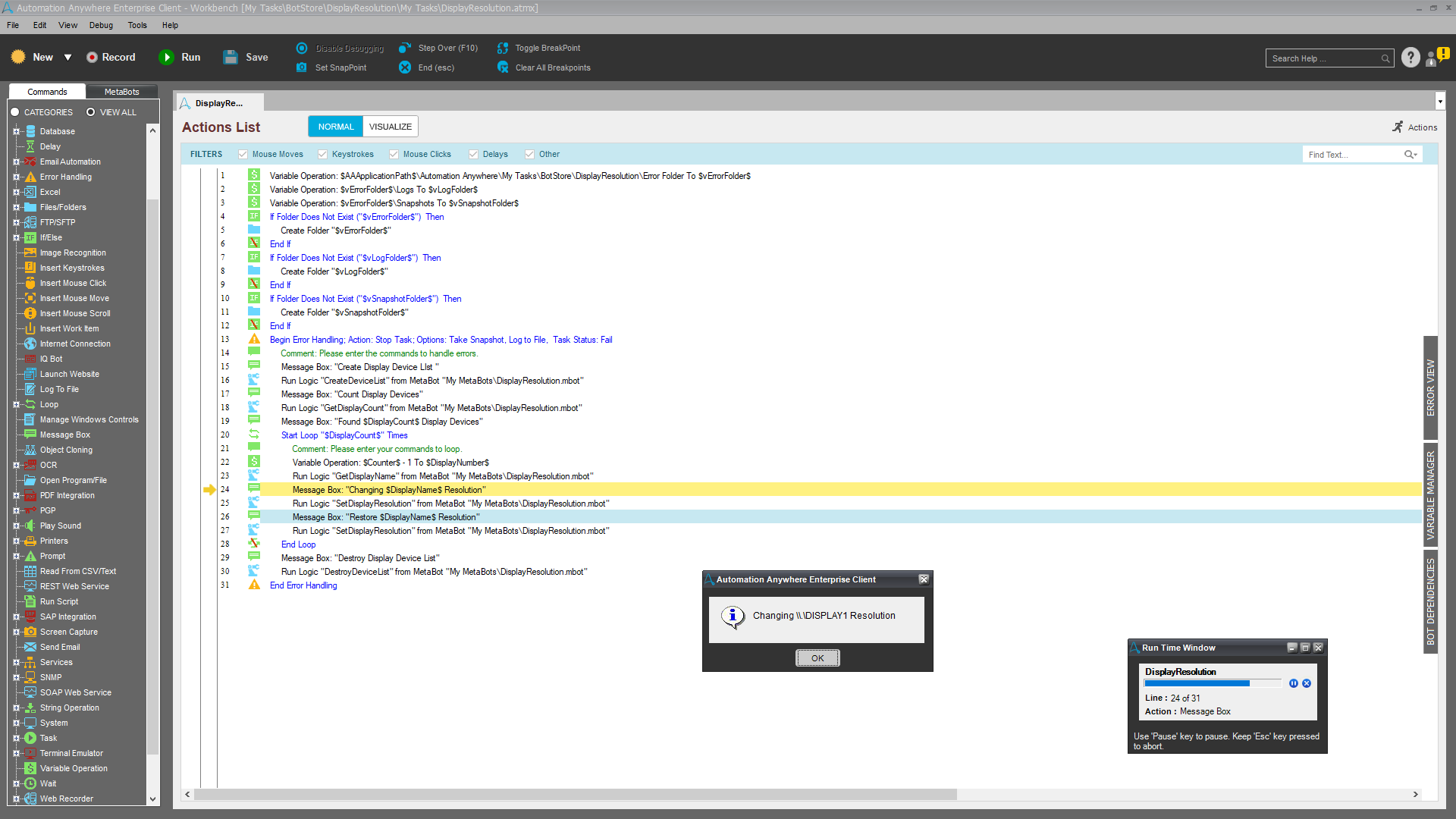 In order to run this bot, we first have to navigate to the “Bot Store Display Resolution My Utils” folder, either with the command prompt or with Windows Explorer and run the command line script BotFix.cmd by double clicking on the file. The BotFix.cmd command script will copy the very necessary sDispRes32.dll to the temporary folder C:ProgramDataAutomationAnywheretemp on your system. As long as you need to use this bot the DispRes32.dll has to be in the above temporary folder, no other place. You can clean it out when removing this bot.
