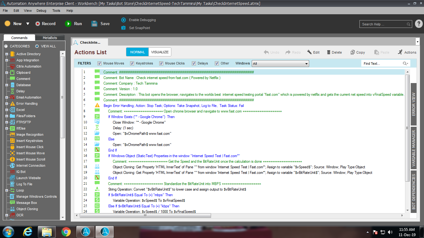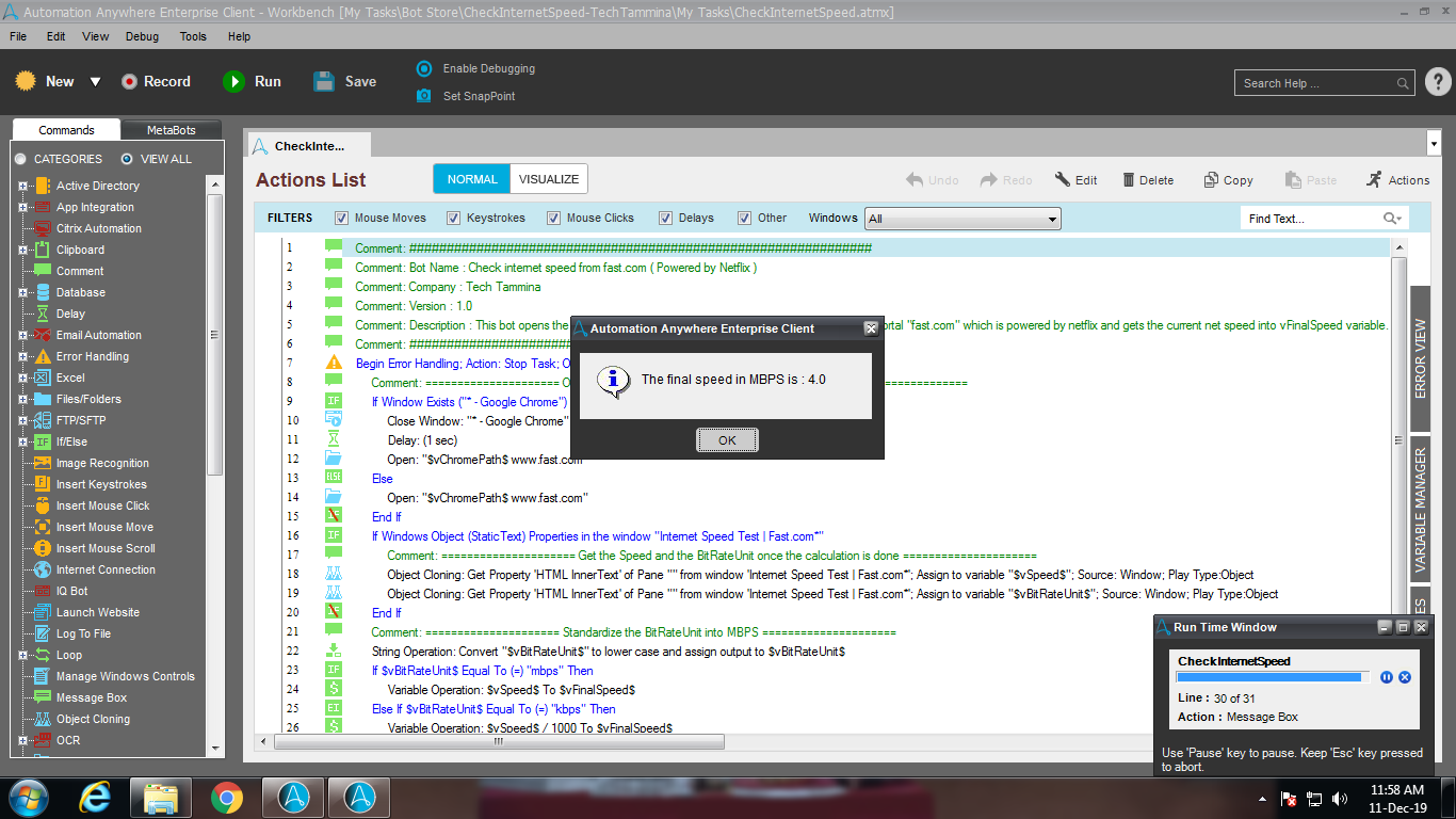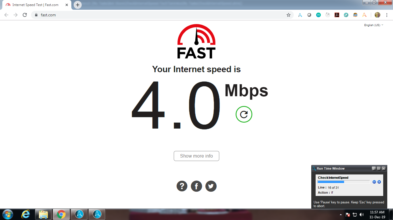 This bot checks the internet speed by accessing the fast.com website. It can be used as a sub-bot to trigger bots which require specific internet speed
