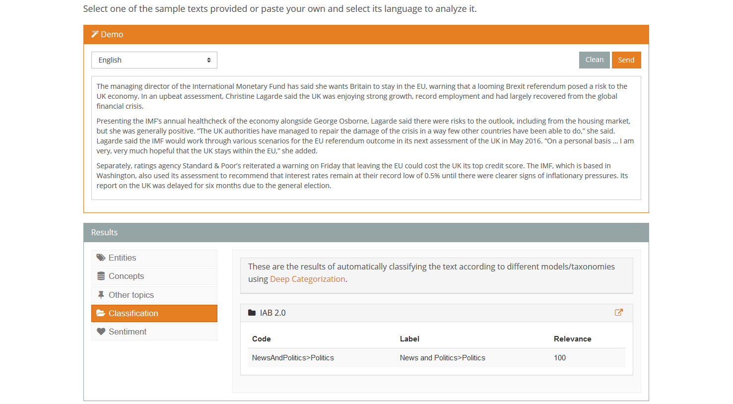 This bot uses the MeaningCloud Deep Categorization API and its implementation of the enhanced IAB Content Taxonomy v2.0 to categorize a text according to nearly 400 categories in the taxonomy. MeaningCloud’s implementation of the IAB Taxonomy covers all 29 Tier 1 and all 341 Tier 2 categories.