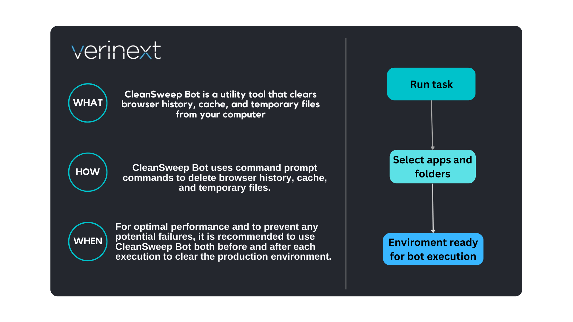 CleanSweep Bot is a utility tool that clears browser history, cache, and temporary files using command prompt commands