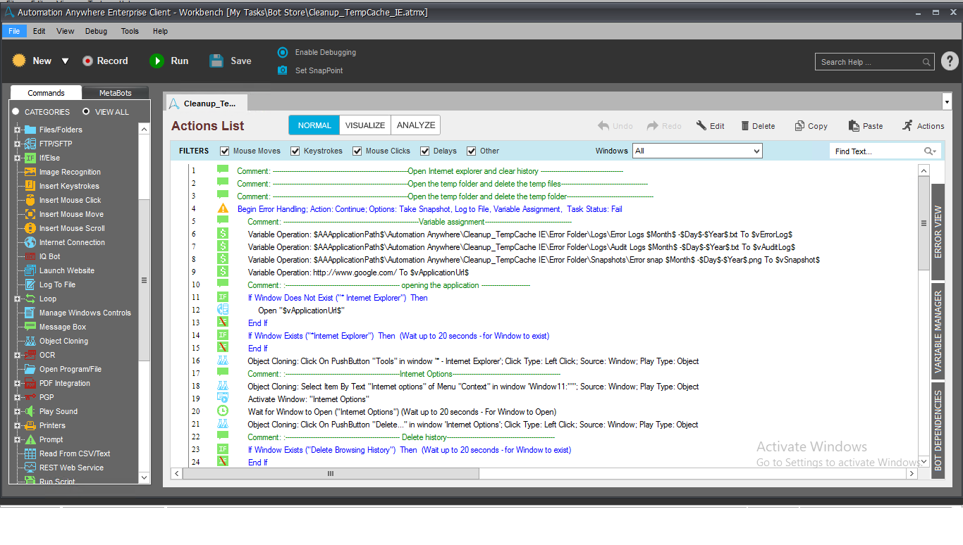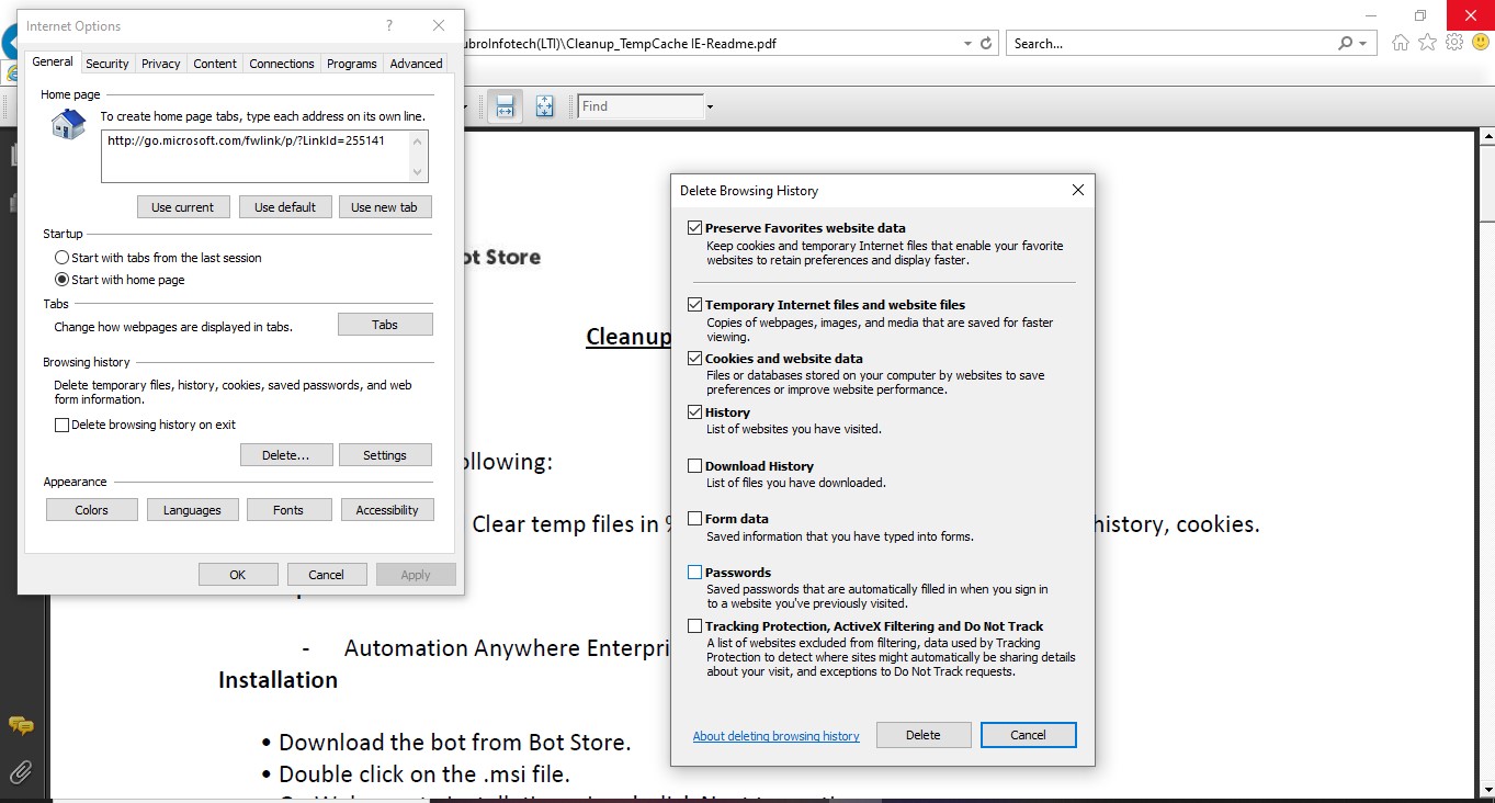 Internet Explorer is widely used browser for RPA Processes. Every time when process is getting executed, IE creates cache and temp files. This Bot will clear temp files in %temp% folder and IE cache, history, cookies, and make entire process run as fresh.