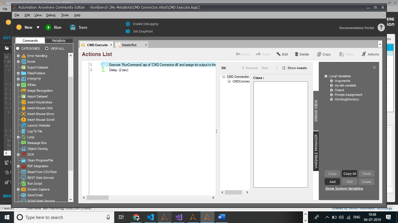 - Inputs: 1.WorkingDirectory - define the path from which you wish to execute the cmd command Arguments - the cmd command which you wish to execute