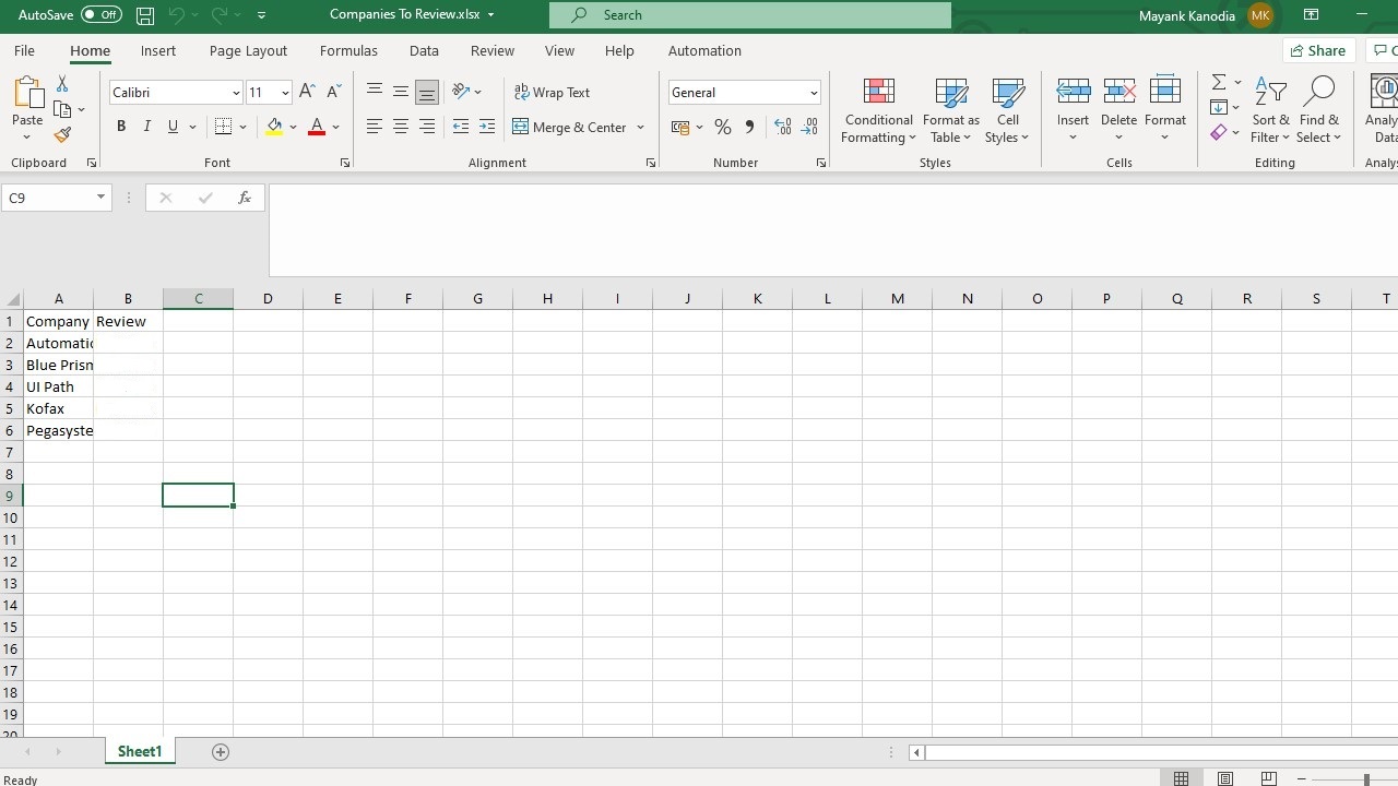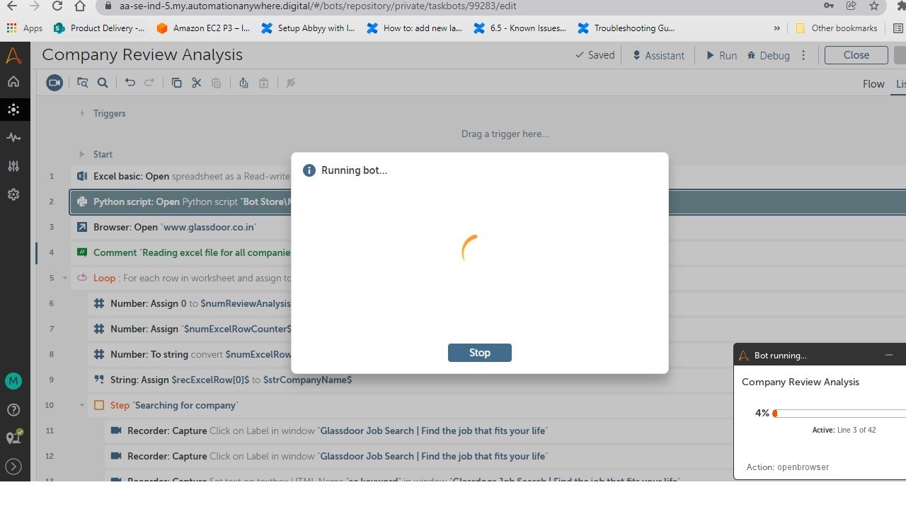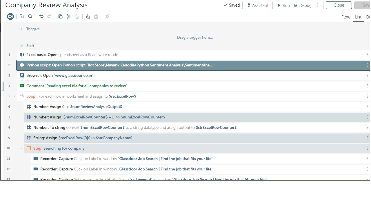 The bot reads an Excel file to fetch the top 5 reviews from Glassdoor for each company in Excel. After fetching the reviews, it calculates the average polarity of all 5 reviews using Python Sentiment Analysis function. Based on average polarity, the company is marked "Positive" (for polarity > 0) or "Negative" (for polarity < 0) in the Excel sheet.
