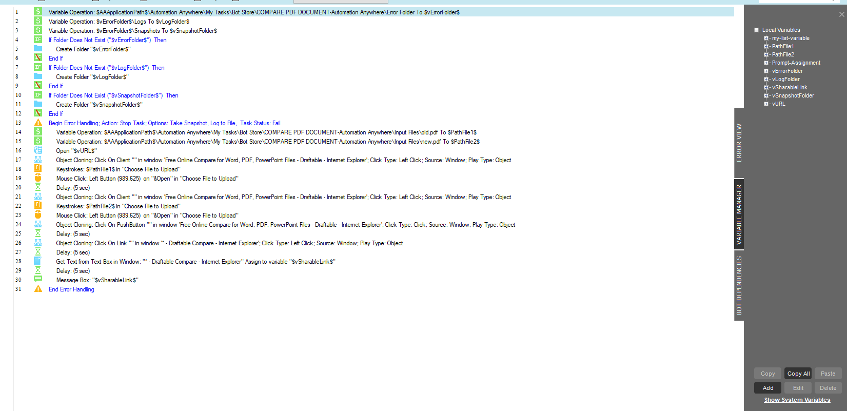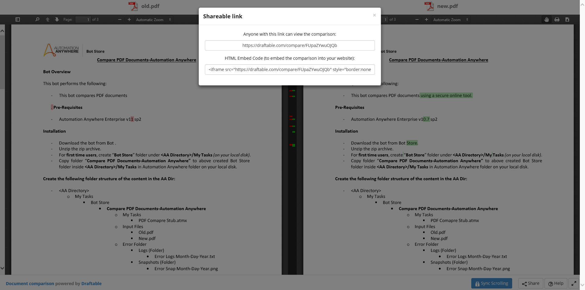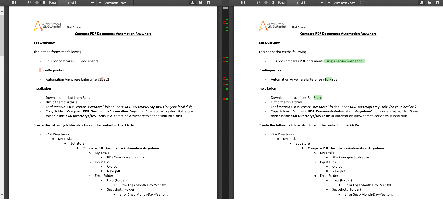 This bot compares PDF documents using a secure online tool. This bot is provided by Automation Anywhere.