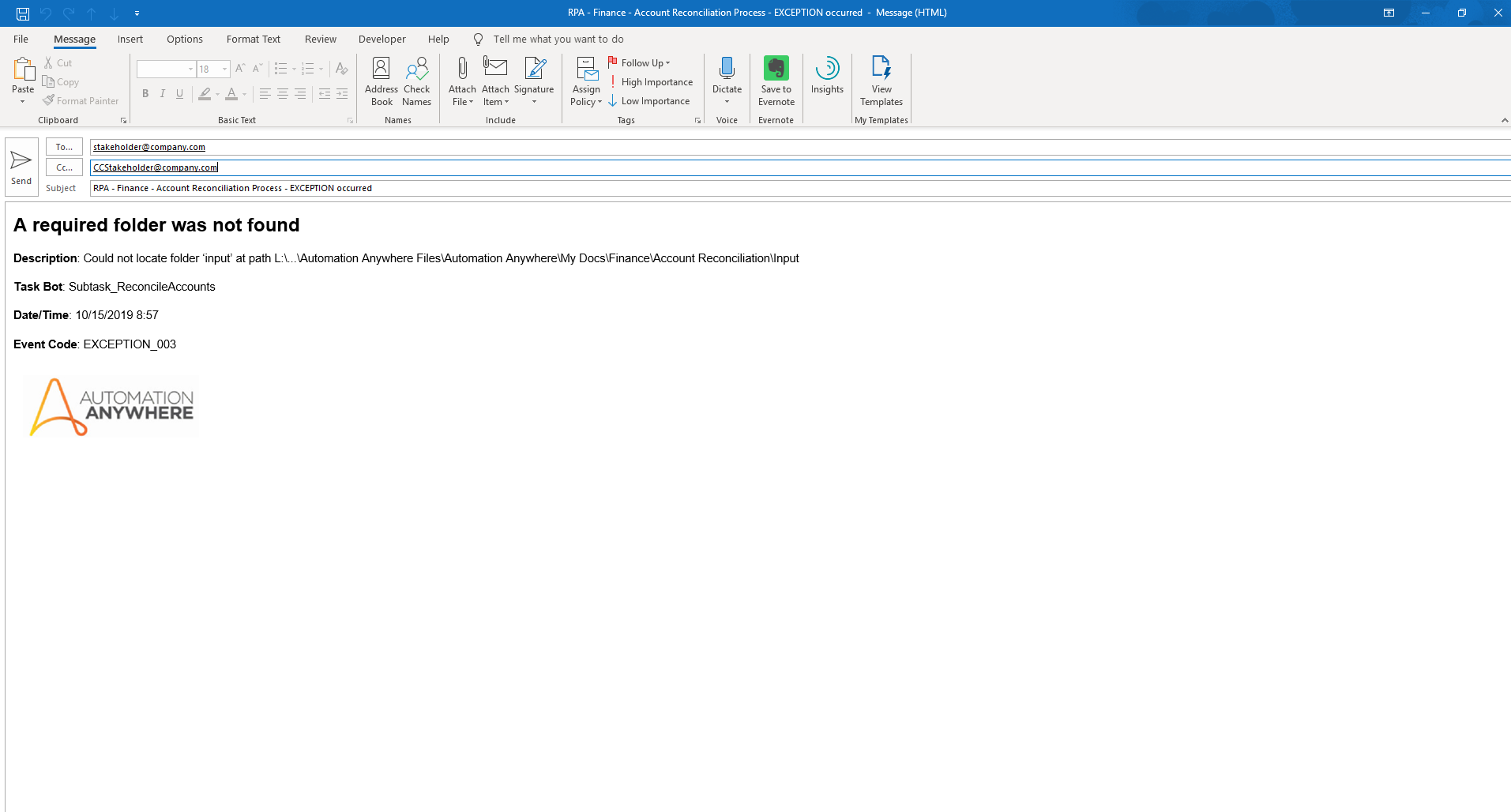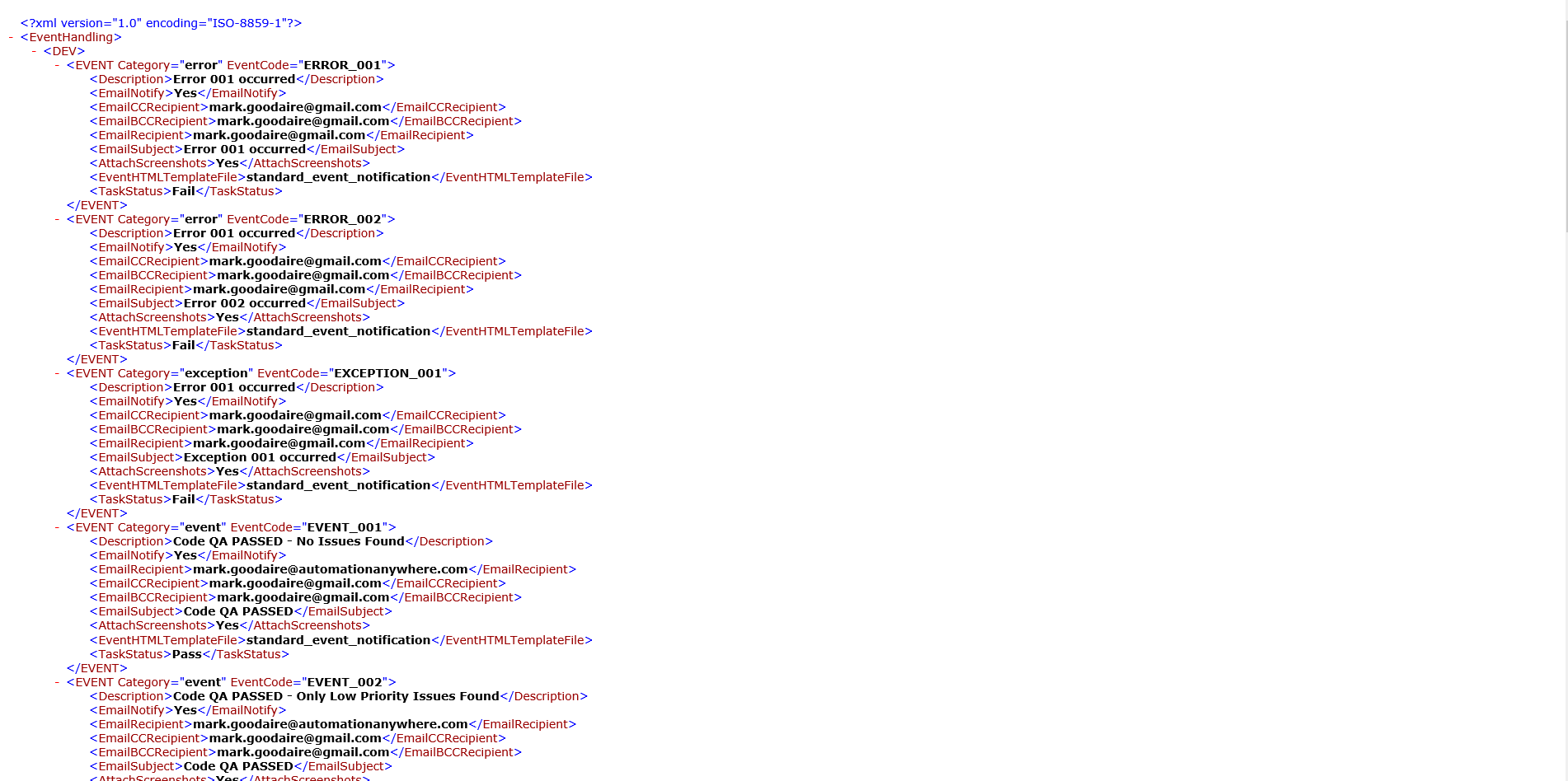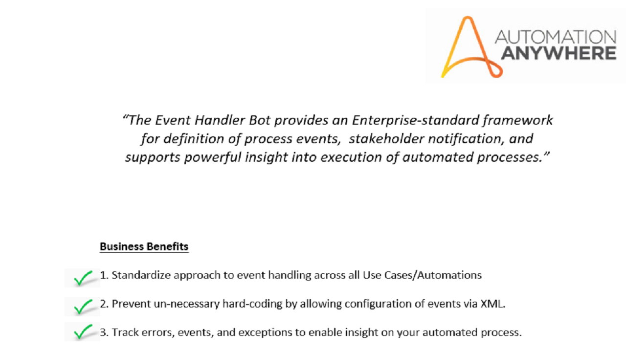 A common property of all automations are that key ‘events’ may occur, that require specific action. This action is often logging the information for subsequent analysis, and notification. The Event Handler bot supports Automation Anywhere’s best practices for bot development, by enabling this functionality in a way that is configurable – minimizing any need for ‘hard-coding’ the definition.