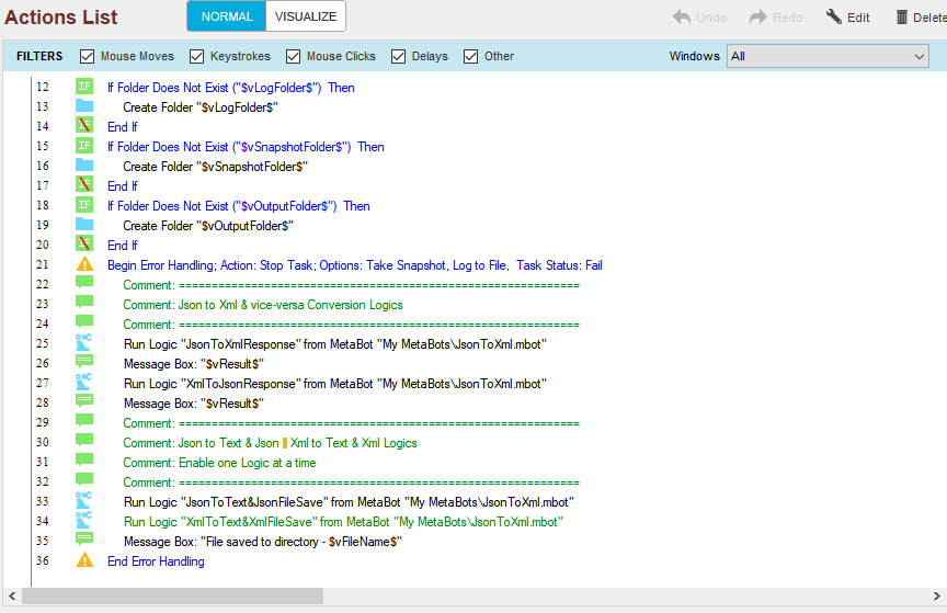 Key Use Case: Helpful when making REST web service requests and receiving REST web service responses which come in the form of JSON. Through using this included MetaBot, developers can quickly convert, and parse JSON responses in the form by utilizing existing XML commands.