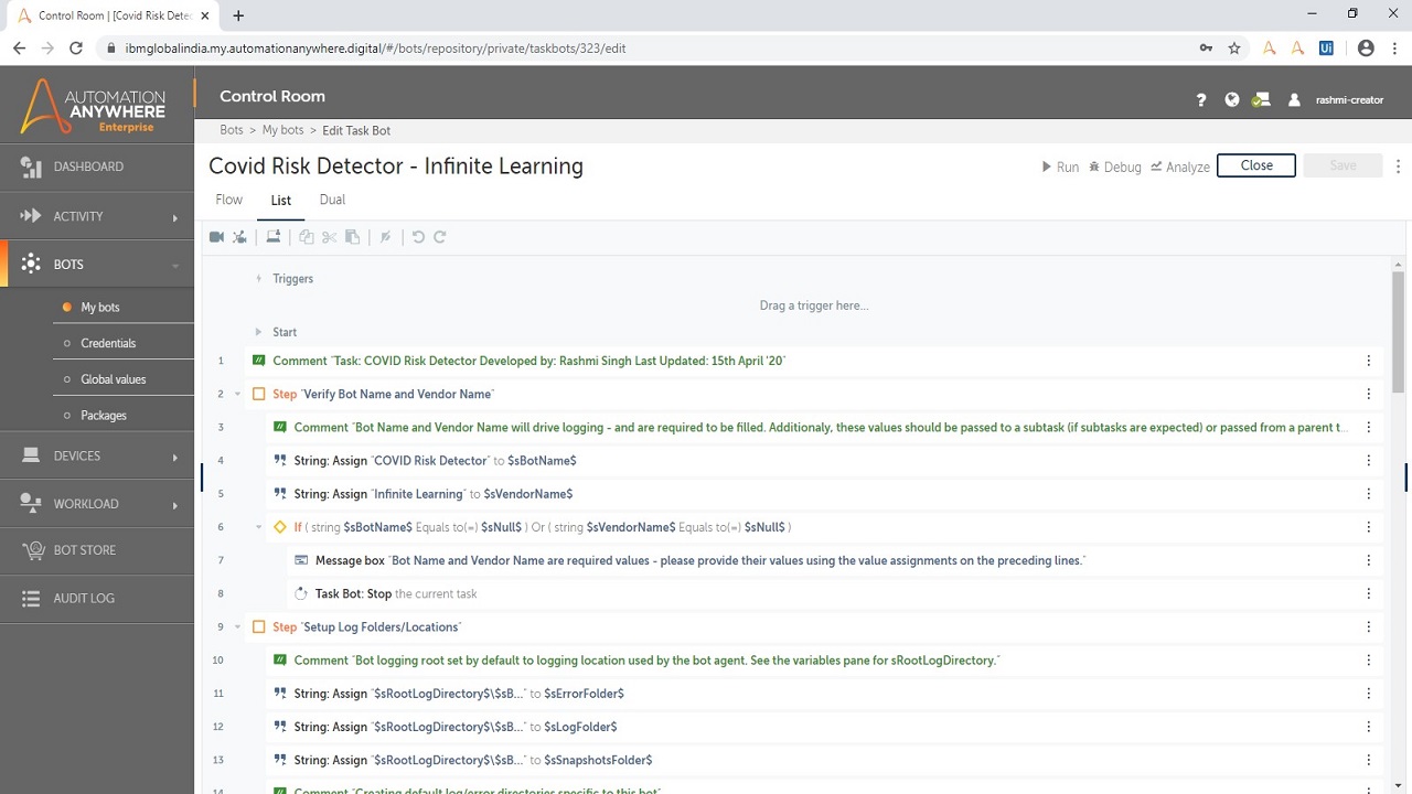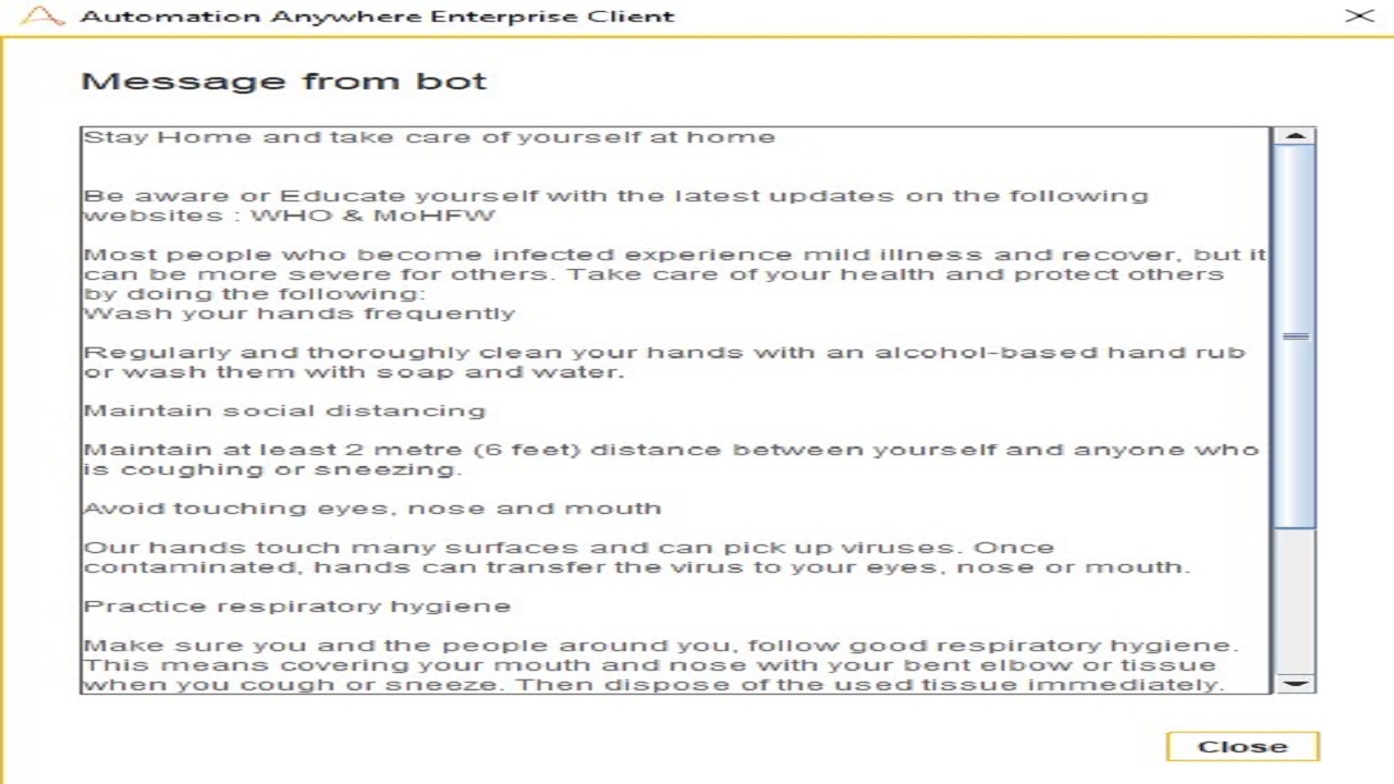 This bot is made for self-assessment of the risk of Covid-19 Pandemic disease. The scanner has been developed on the basis of guidelines from the WHO. This bot works with Enterprise Automation 360.