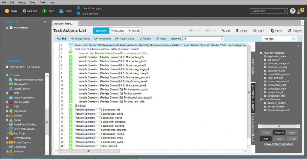 This bot is a demo designed to demonstrate the process of creating an Account Reconciliation Dashboard in Bot Insights based on information provided in a sample CSV (provided).