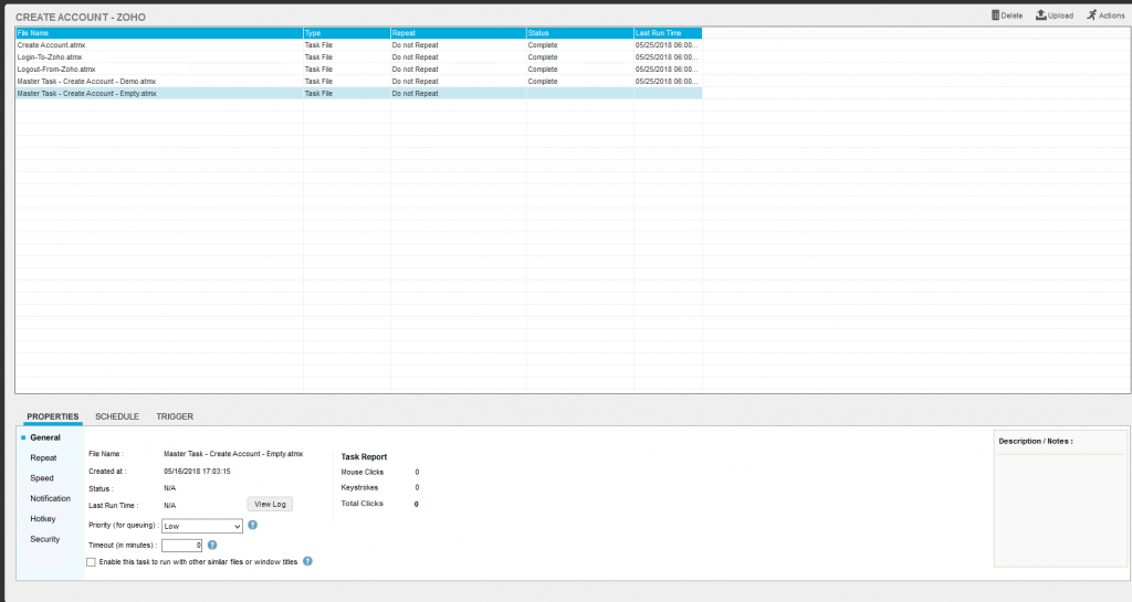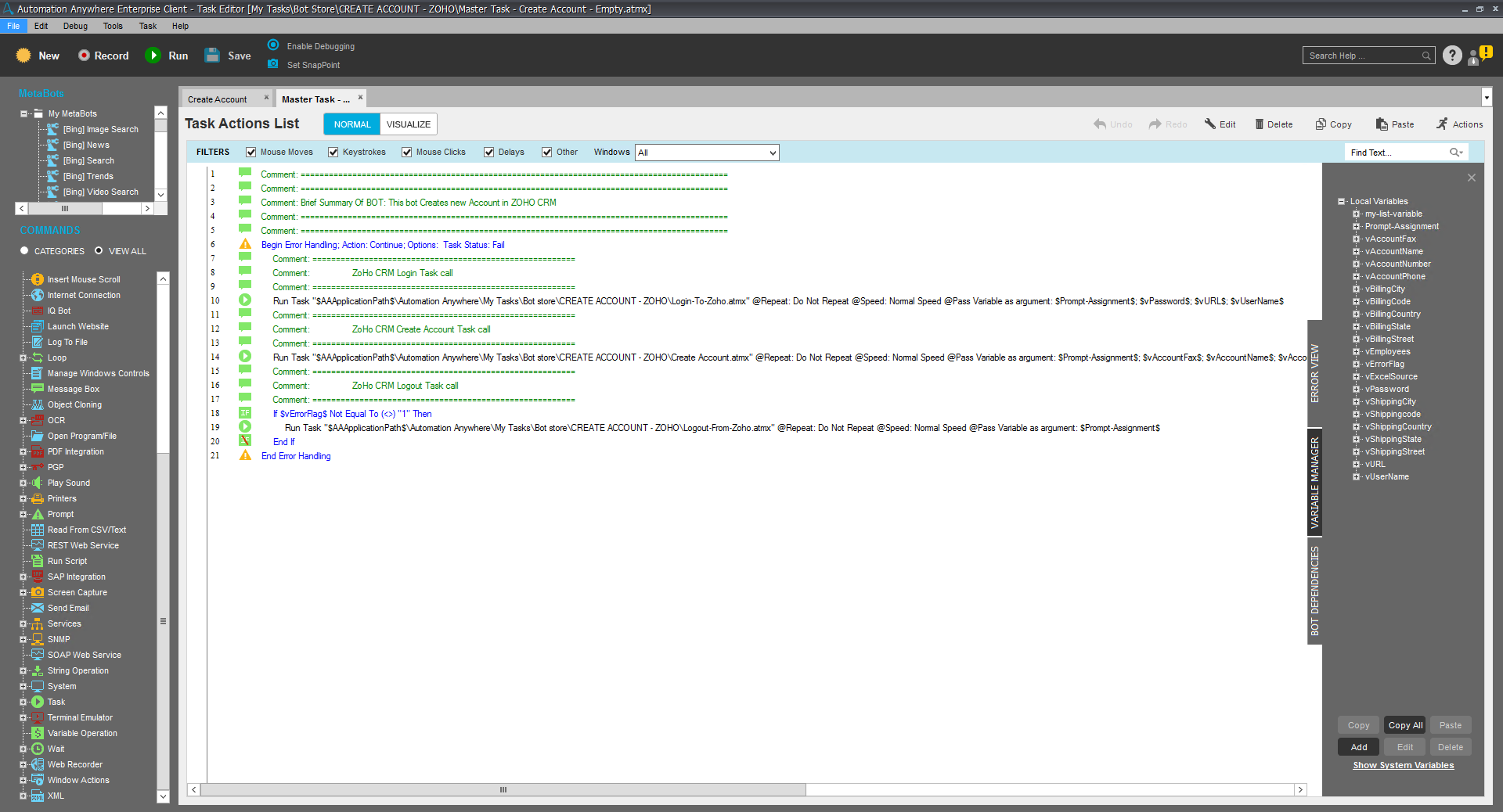 - Required access of ZOHO application, Required Automation run-time client installed, Required all Bots for Create Account process and all this bots should be place in a specific folder.