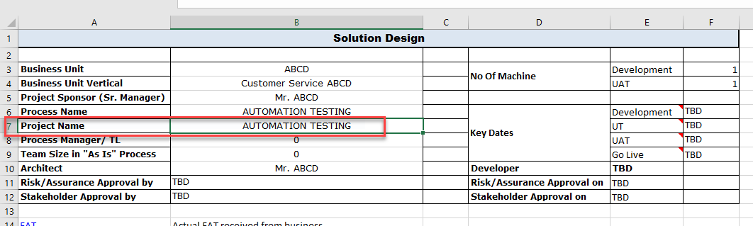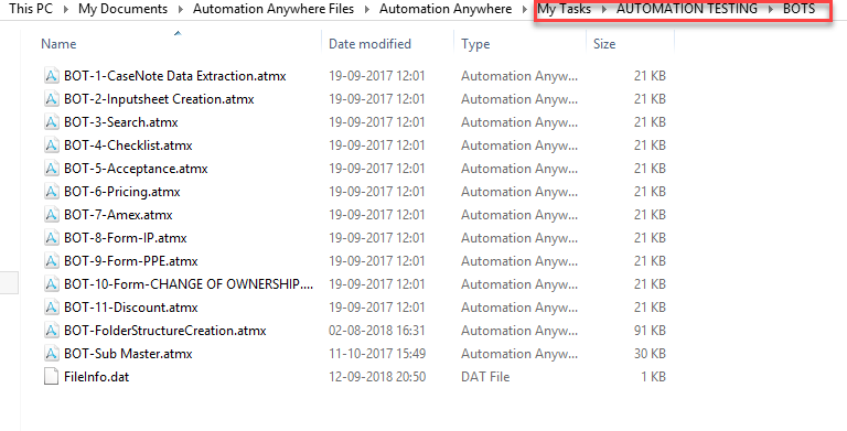 - Inputs: Solution Design: Solution design is a excel file which includes detail information of the process. Bot is basically targeting at 'Index' and 'Bot Descriptions' sheets. It will take the process name from the 'Index' sheet and all Bots name from the 'Bot Descriptions' sheet to create all the bots under 'My Task'.Business Shared drive path: Bot will give the prompt to take the 'Business Shared-drive Path' to create the whole folder structure.