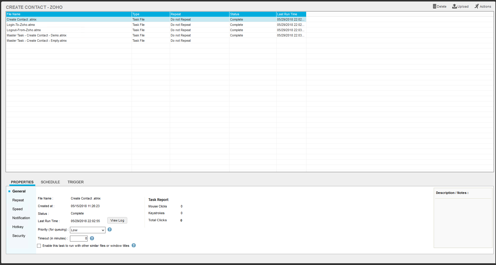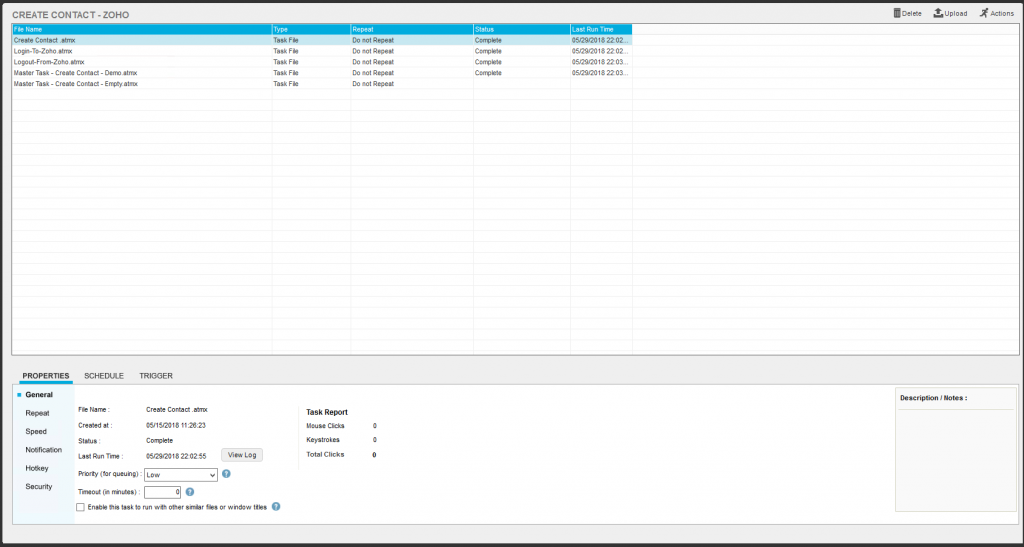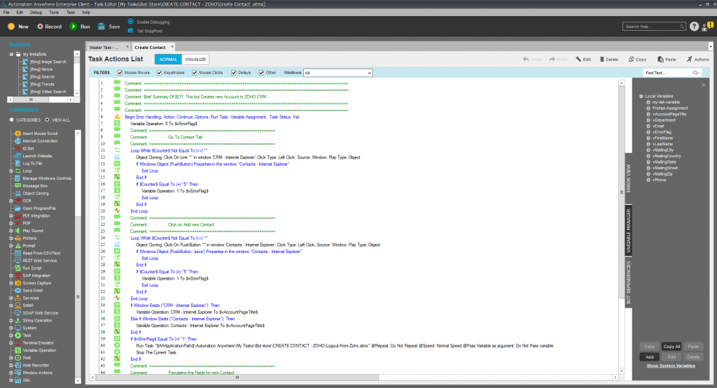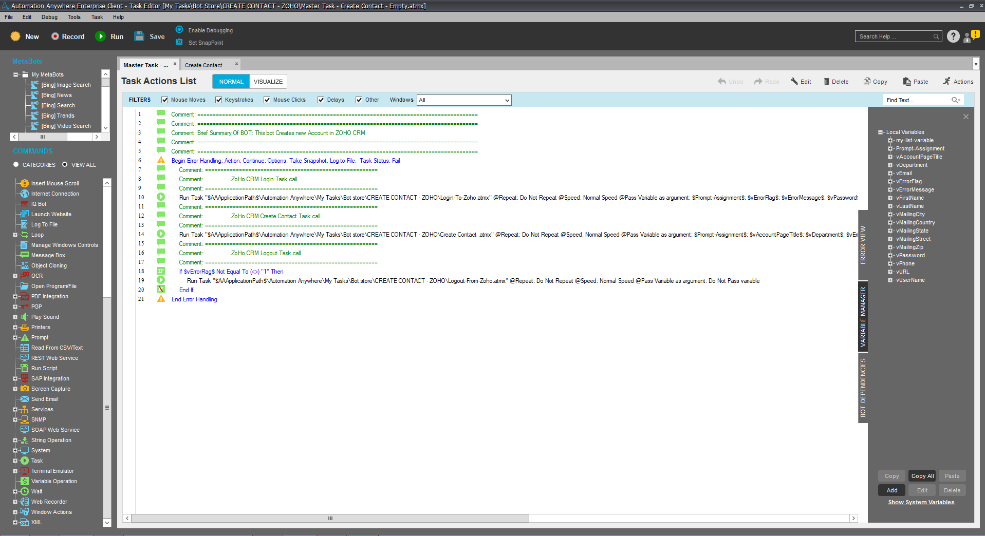 This bot logs in to Zoho and navigates to the contact tab. The user then provides all the mandatory input values to create a new contact.