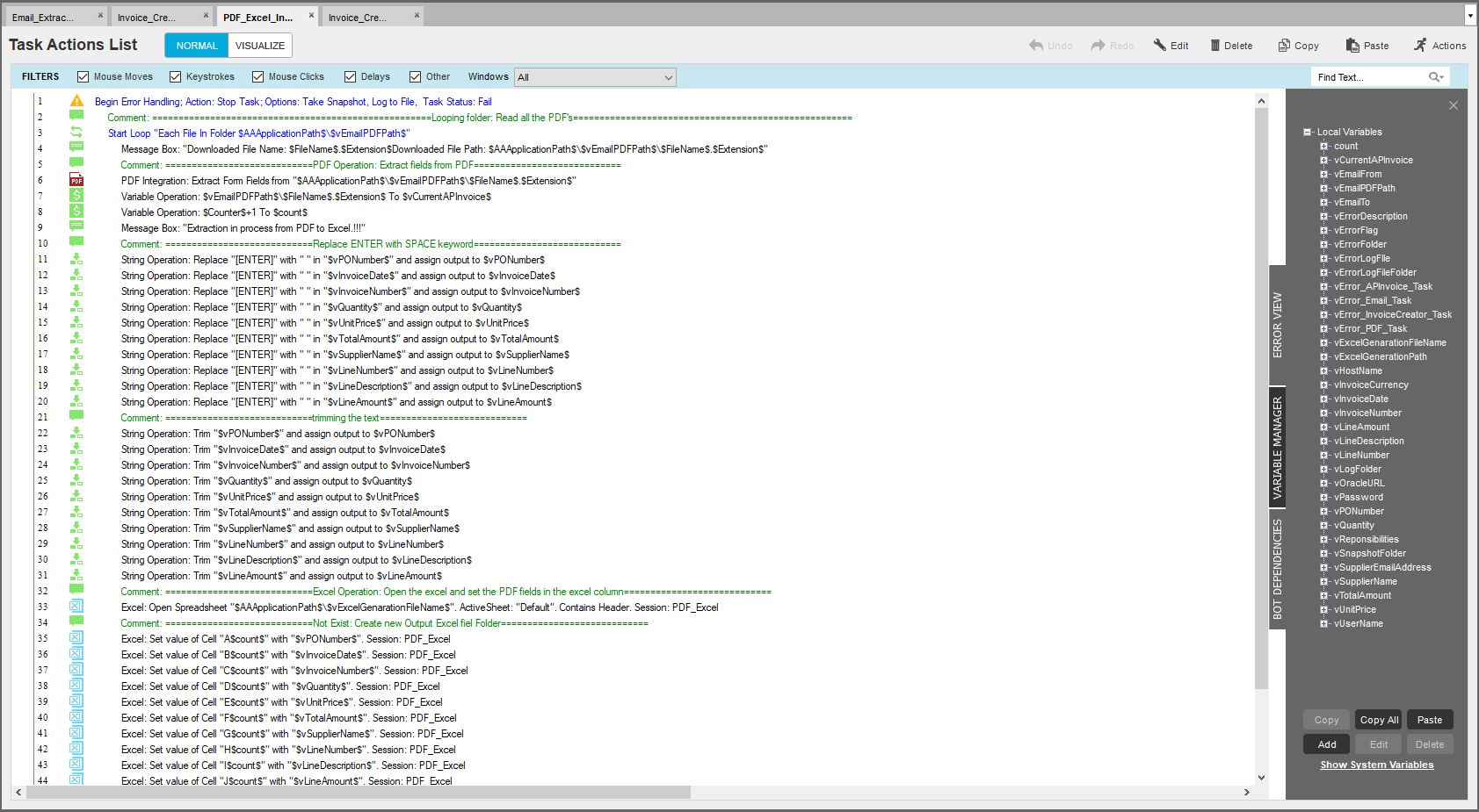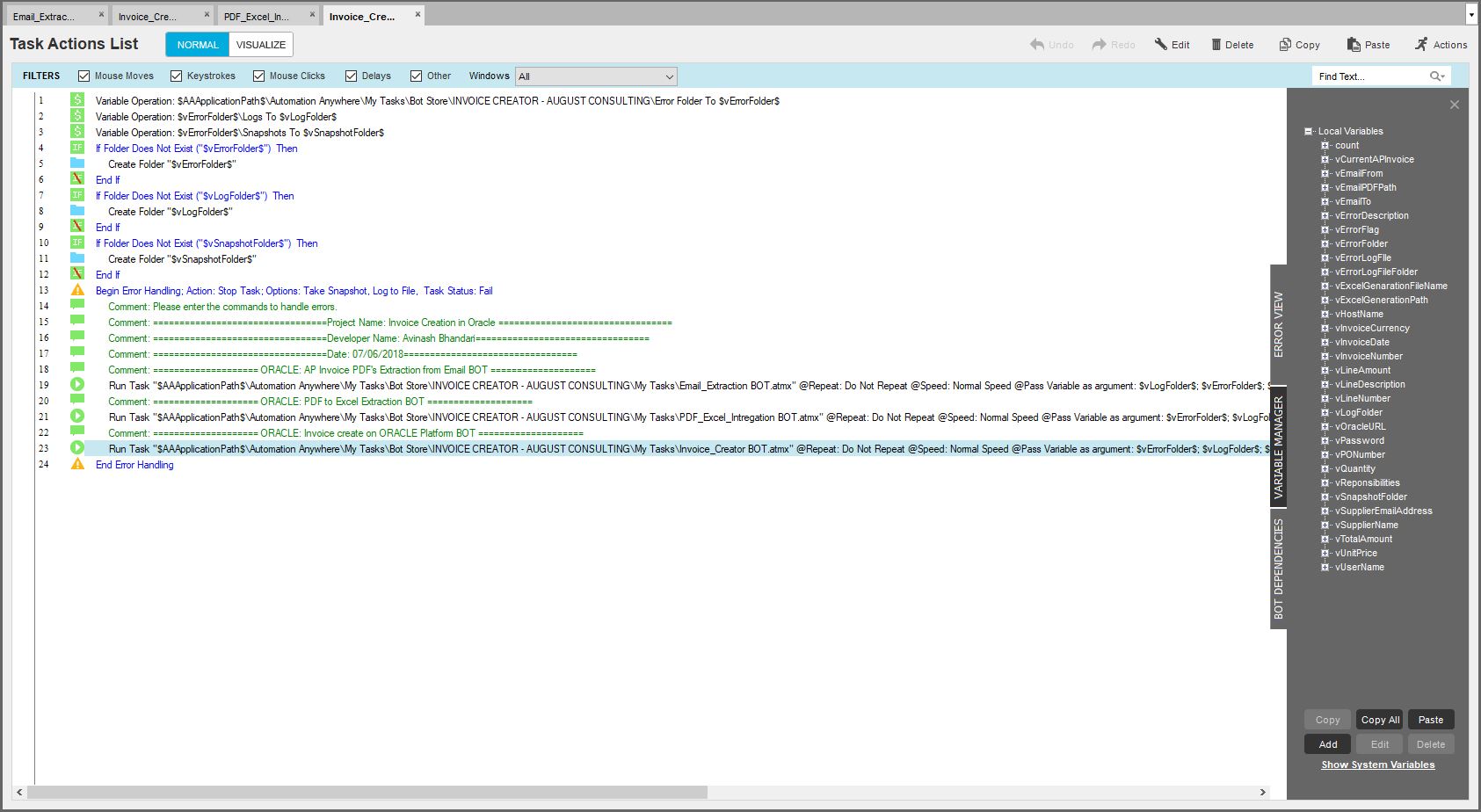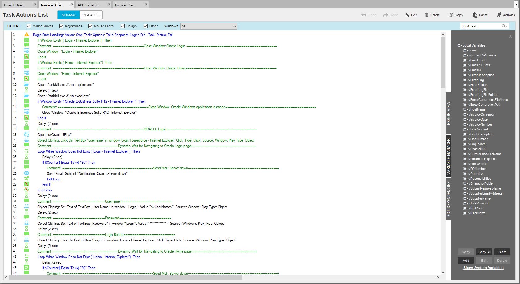 - Variables: vEmailFrom, vEmailTo, vEmailPDFPath, vExcelGenarationFileName, vInputExcelTempFilePath, vExcelGenerationPath, vExcelGenarationFileName, vHostName, vOracleURL, vUserName, vPassword, vResponsibilities, vSubmitRequestName, vParameterOption