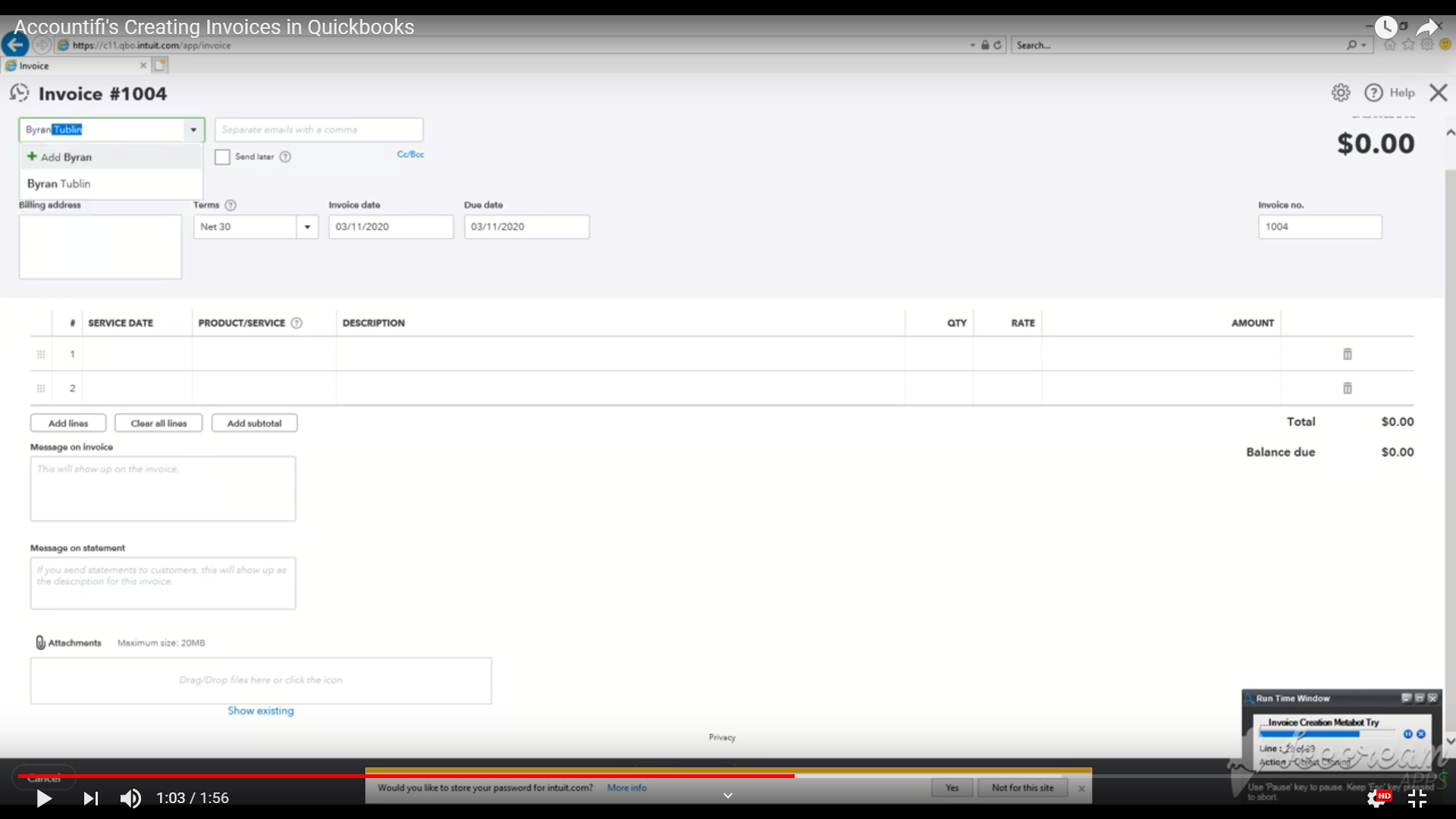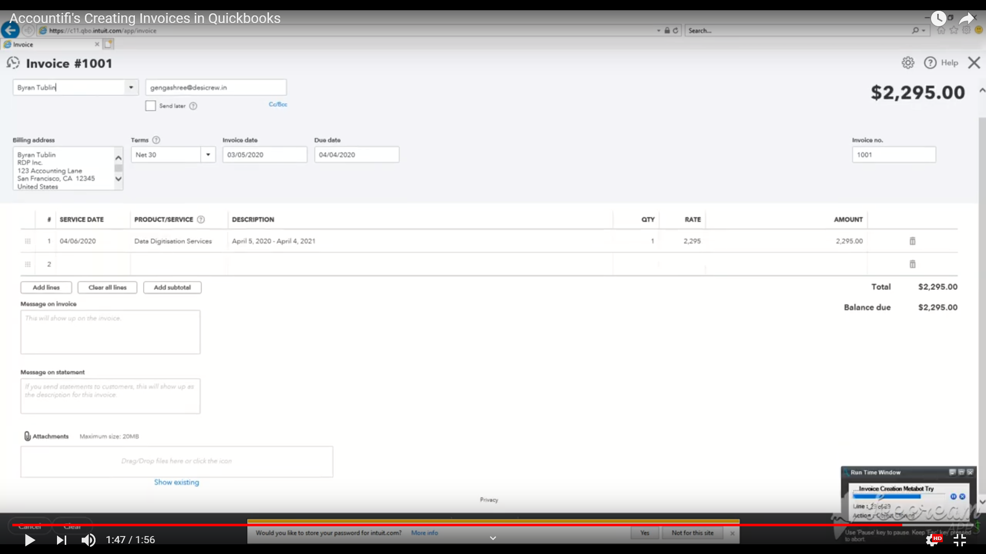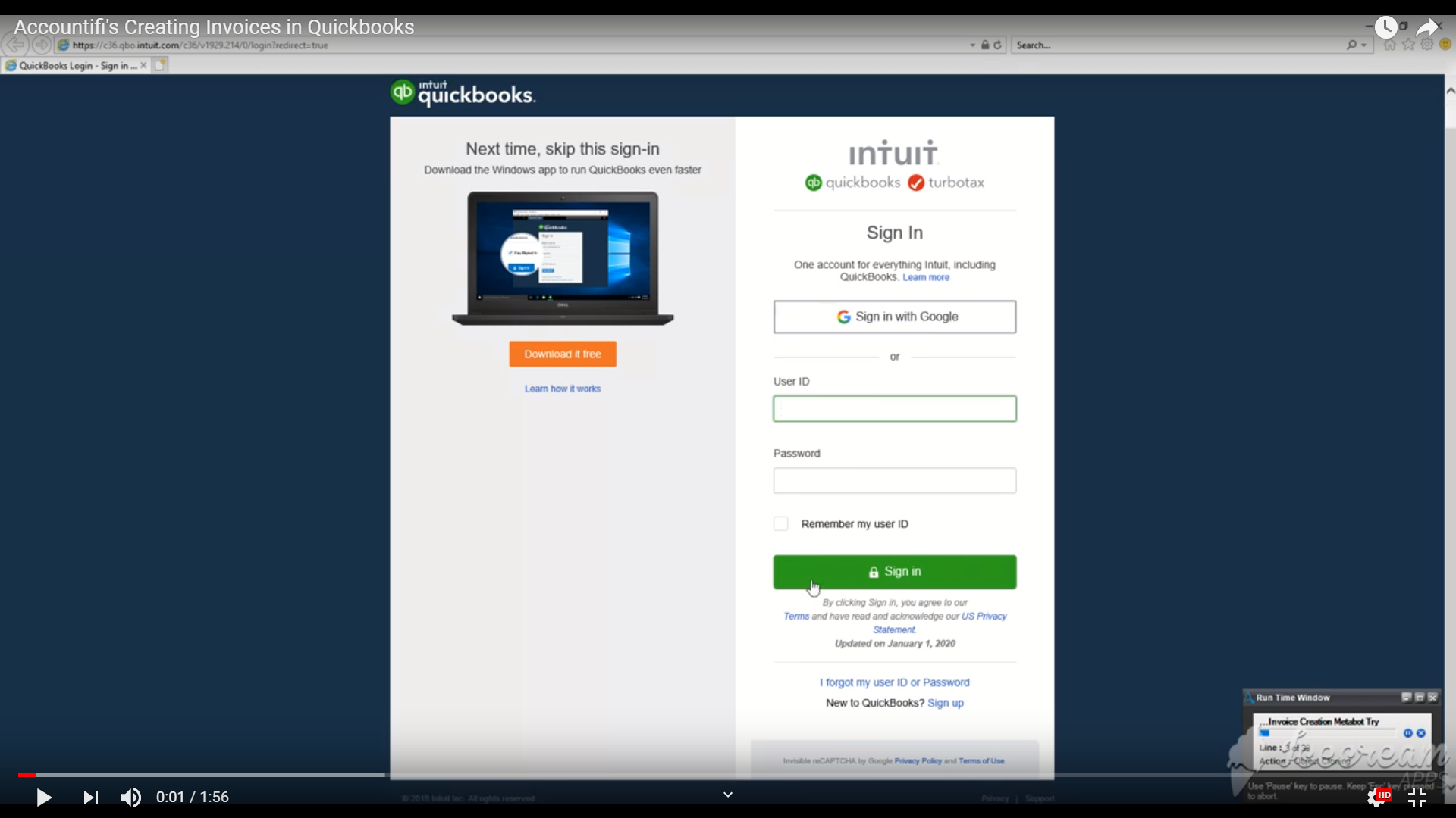 This Bot will take an Excel file as input and it calculates the Due Date. Bot then logs into your Quickbooks account, adds Invoices one by one. This Bot is very handy when you want to create multiple Invoices everyday and you have a list of Invoices to be created in an Excel file.
