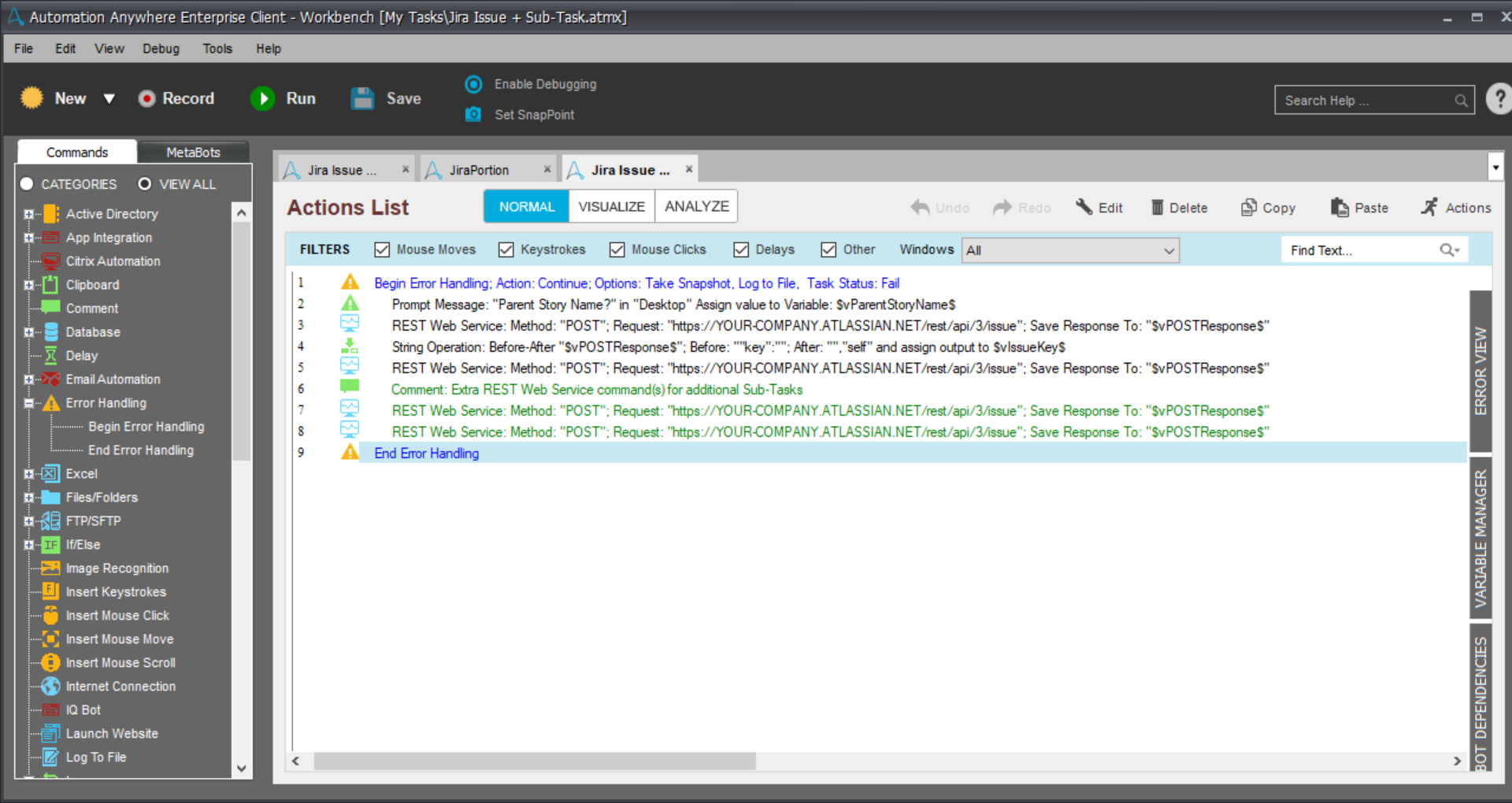 This bot was designed to help anyone looking to integrate RPA and JIRA Cloud by allowing them to create new JIRA issues/stories with the added option of creating/attaching sub-tasks to the new issues/stories.