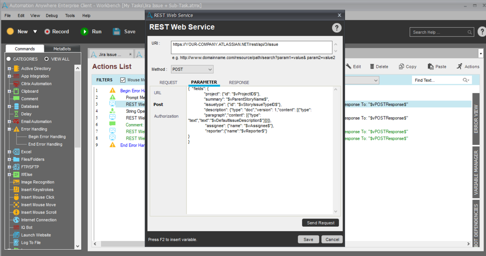 - Inputs: vJiraAuth (more info in ReadMe - Jira Issue + SubTask(s).pdf), Project ID, Story Issue Type ID, SubTask Issue Type ID, Assignee, Reporter, Parent Issue Name