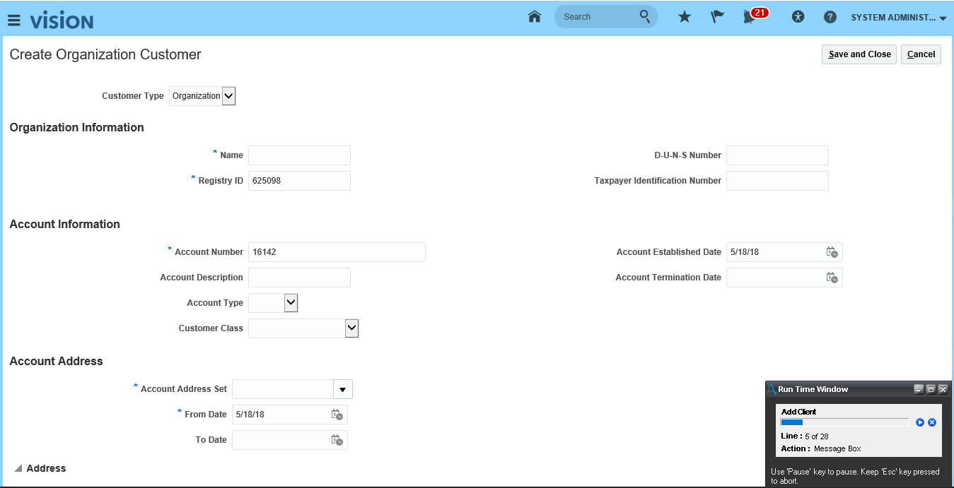 This bot creates a client in Oracle ERP Cloud.