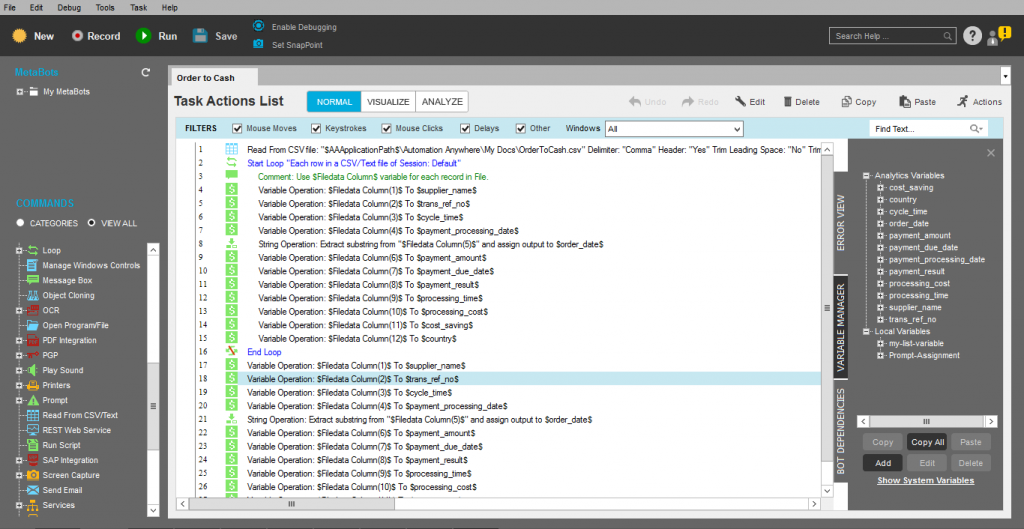 This bot is designed to work as a demo on how an Order to Cash dashboard can be created in Bot Insights. To run the example, a user needs to provide input data in the form of a CSV file. A sample of this information is provided in the CSV file included with the bot.