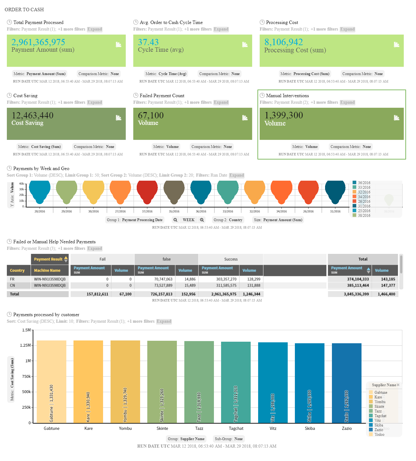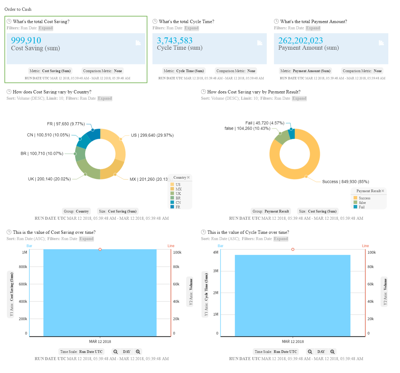 - Bot execution results in auto generated dashboard for the Order to Cash process, showing valuable metrics to the end user.