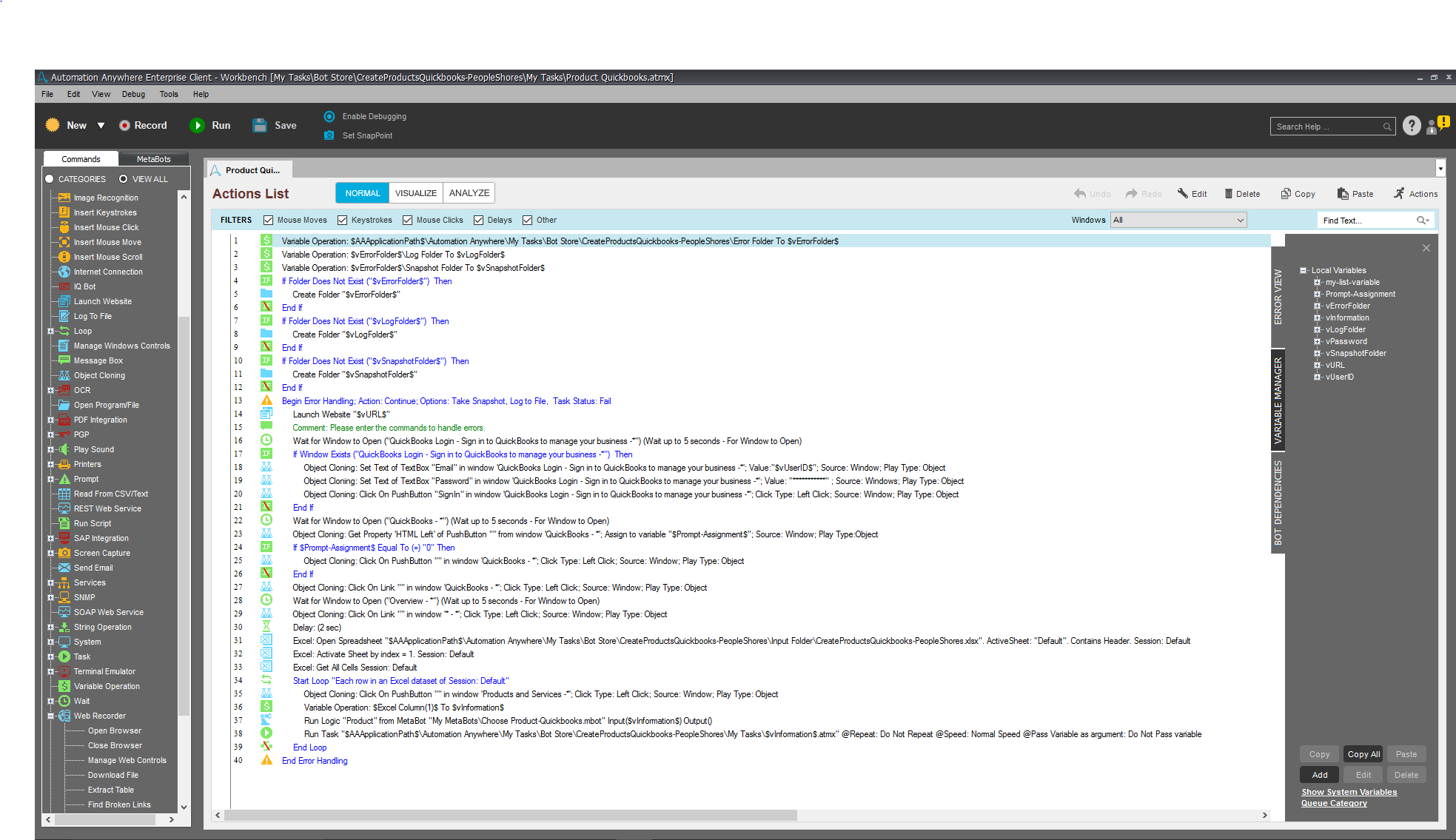 The Create Products in Quickbooks bot reads from an Excel file entitled CreateProductsQuickbooks-PeopleShores.xlsx. The bot is given 4 different fields to automate: Inventory, Non-inventory, Service, and Bundle. The bot calls each field through the Choose Product Quickbooks MetaBot. Each field has its own bot, which is called by the primary bot, Create Products-Quickbooks.atmx.