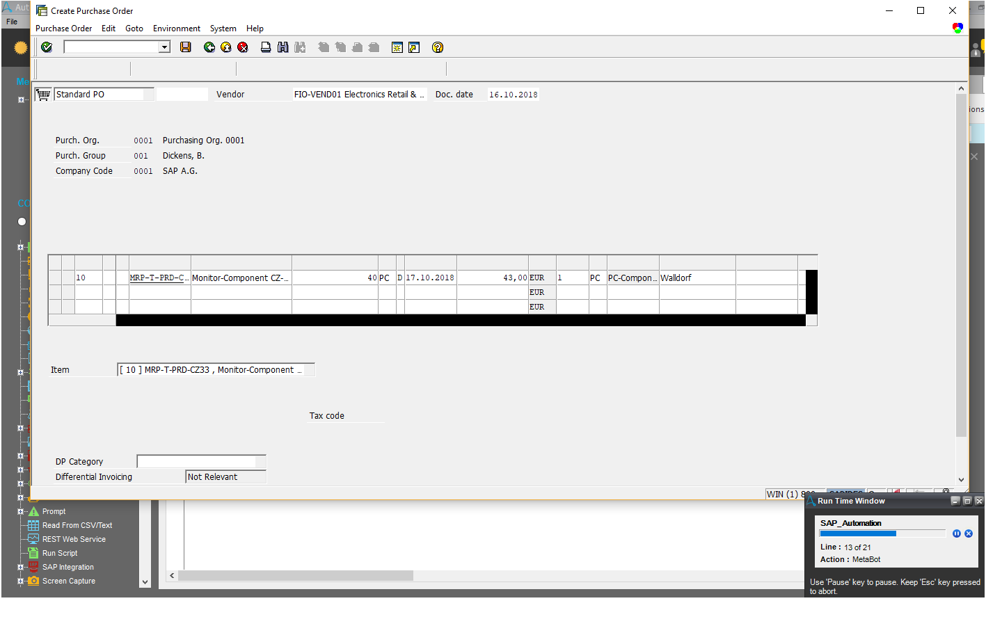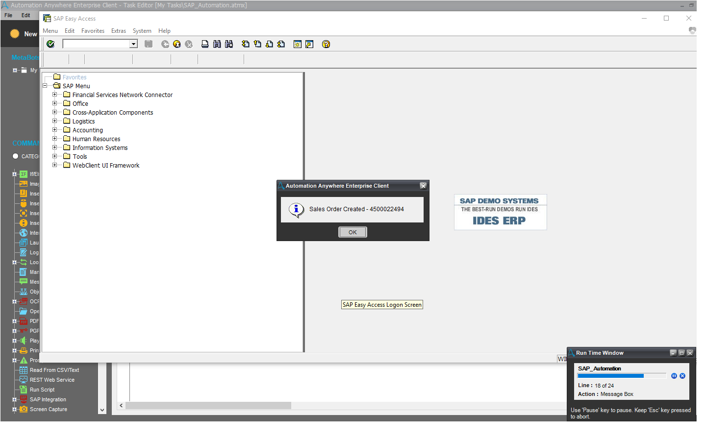 The bot will connect to SAP System and create a sales order, goods receipt and invoice automatically without showing the UI of SAP. it connects via DLL and creates all functions.