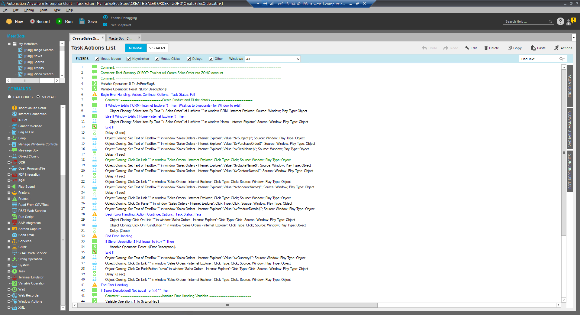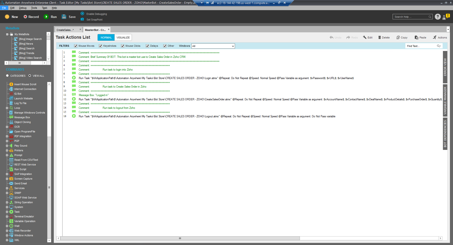 This bot is designed to login into ZOHO, go in the sales order tab, and create a sales order with following details: account name, contact name, deal name, product details, purchase order, quantity, quote name, subject.
