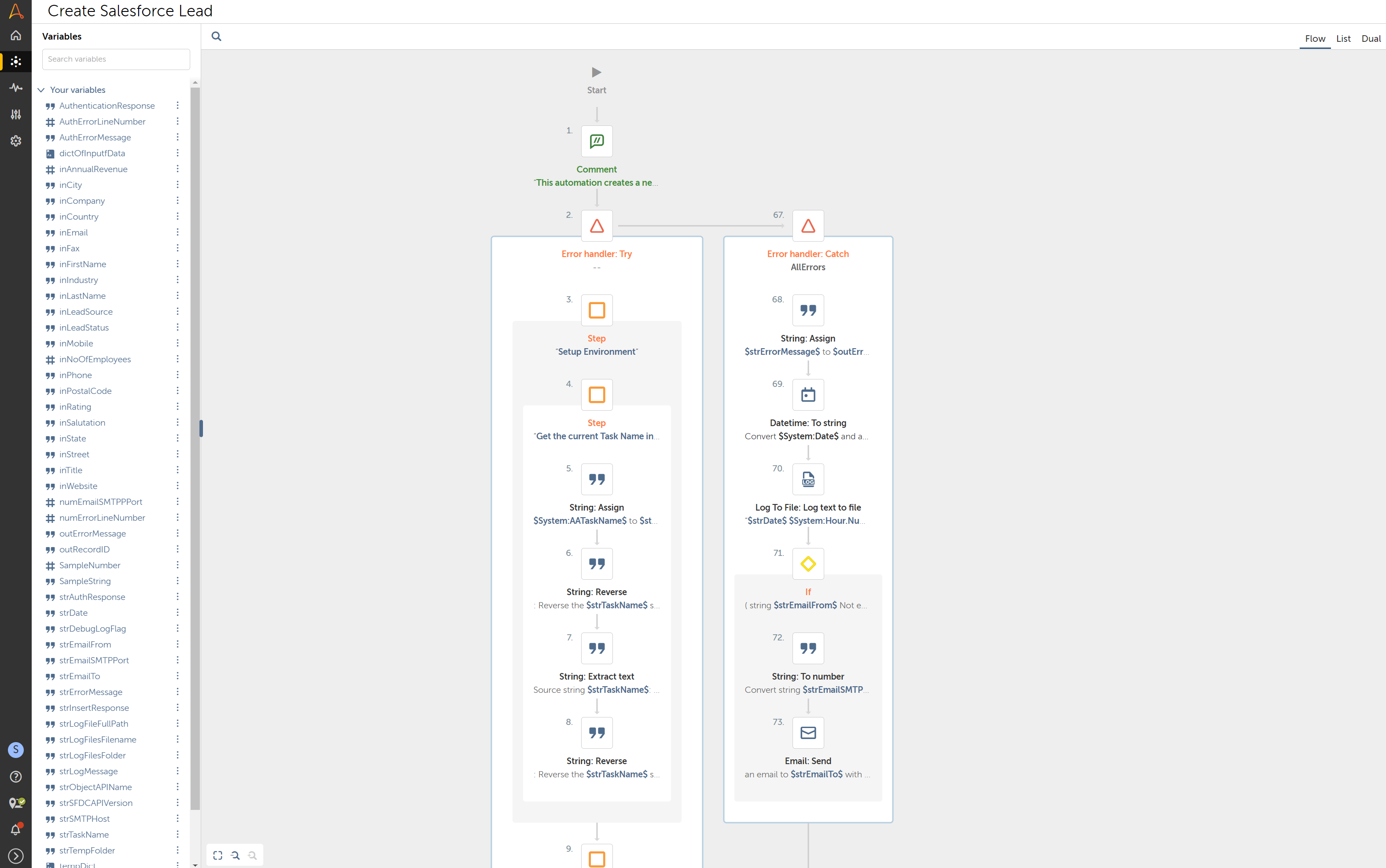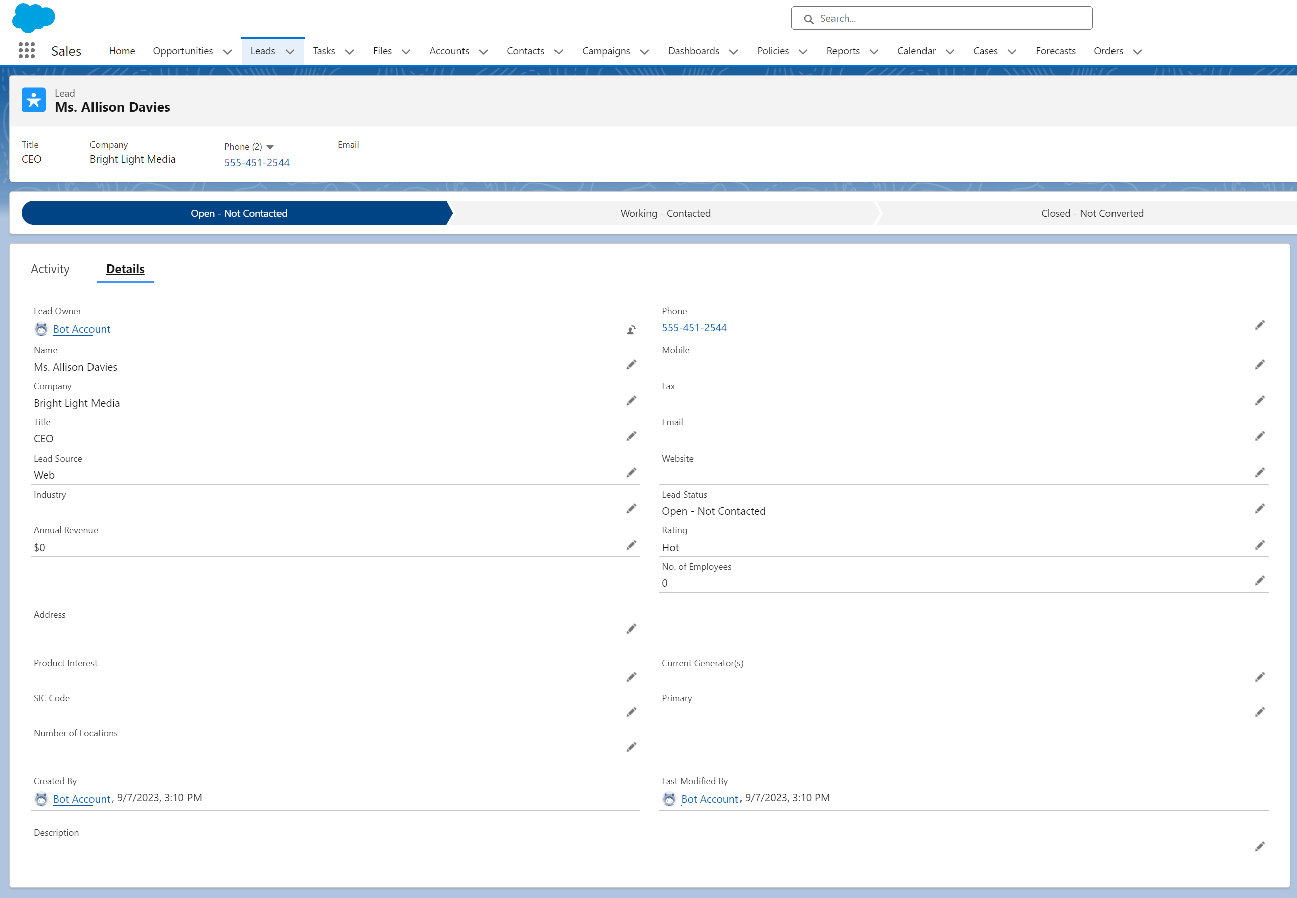 The Create Salesforce Lead bot automates the steps required to create a new Lead record within Salesforce, allowing you to pass in all required attributes for the new Lead. The automation is intended to be fully customizable to meet the needs of your business and the customizations you may have applied to your own Salesforce instances.
